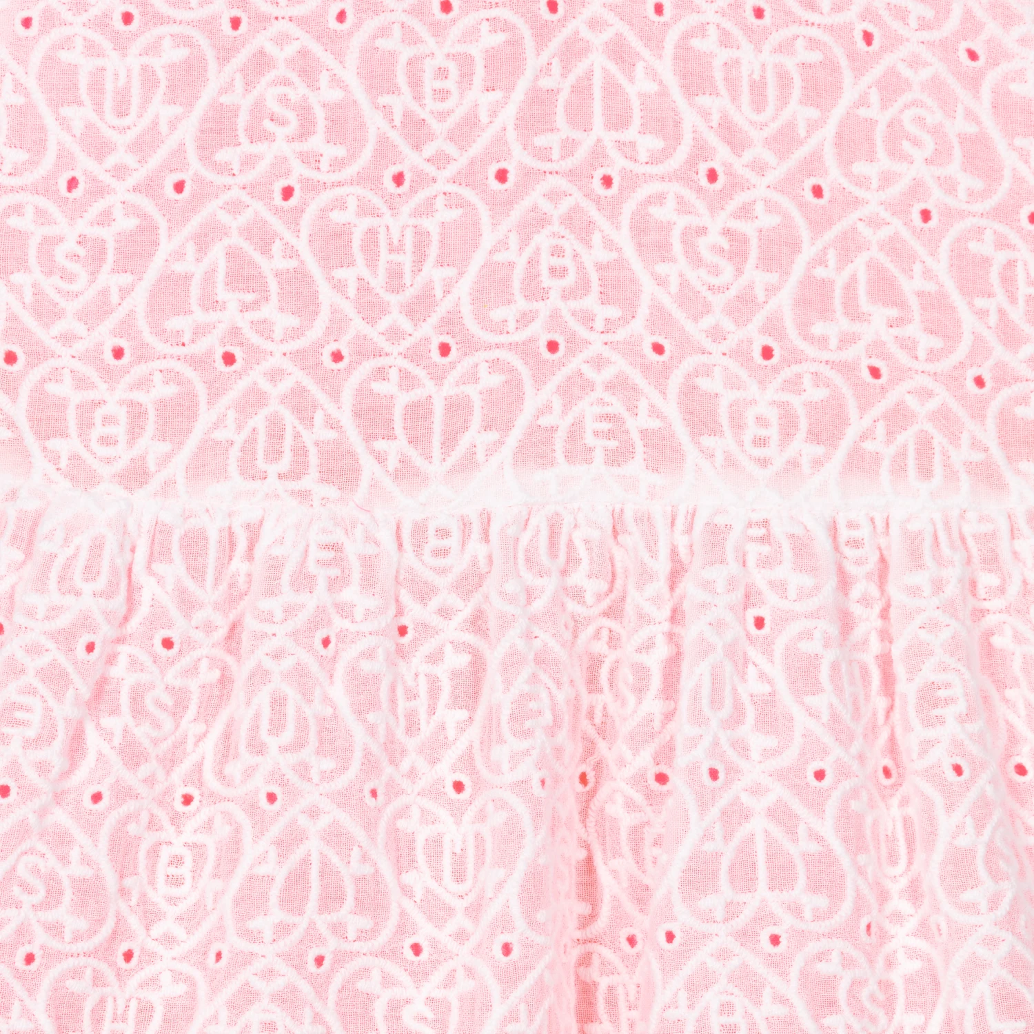 Lovely neon pink and white dress for little girls, by Billieblush. With a neon pink lining, the white embroidered overlay has a sweet heart logo pattern, and a ruffle trimmed hem. Fastening with a concealed zip on the back, it has a colourful and sparkly ribbed neckline, and a logo tab on the side seam.