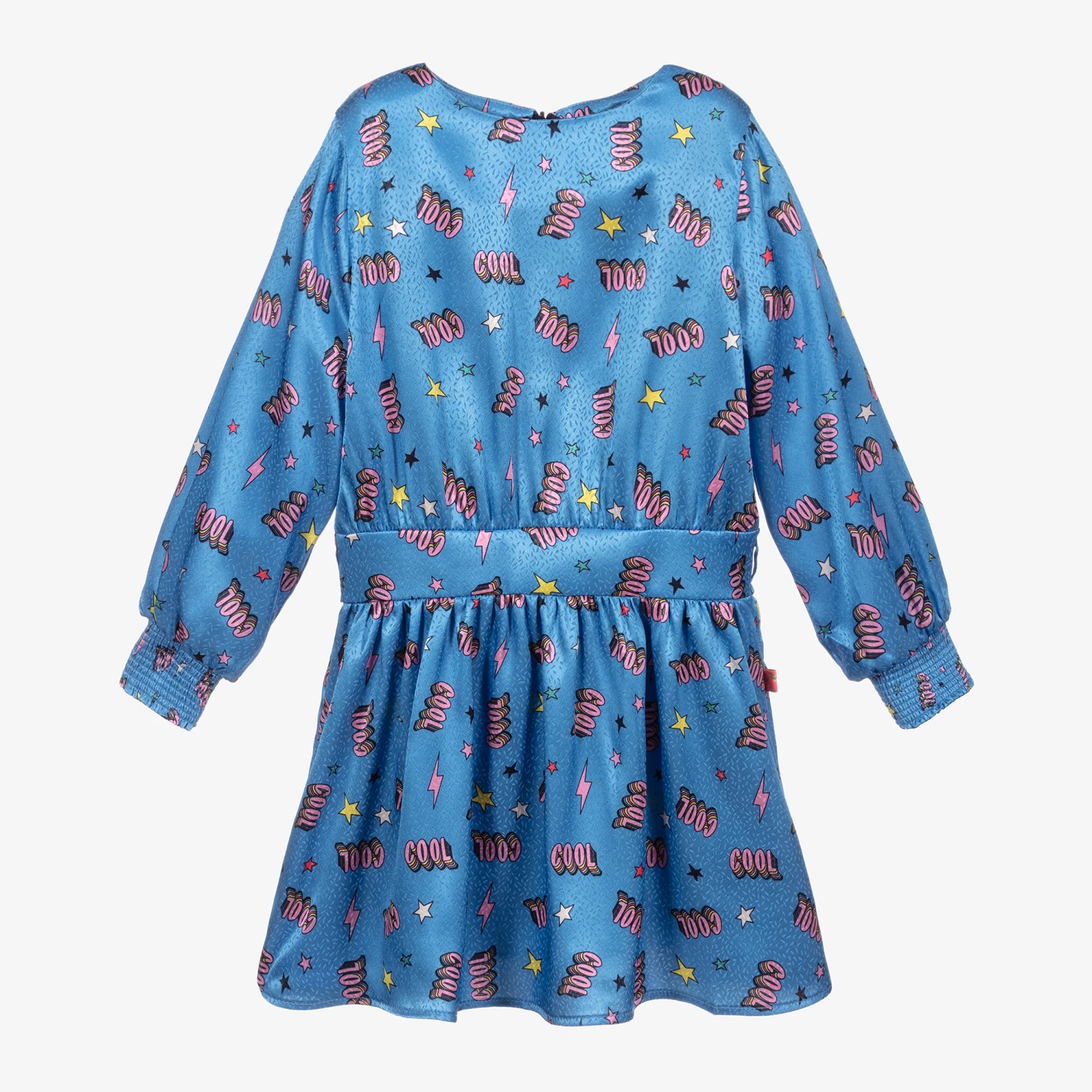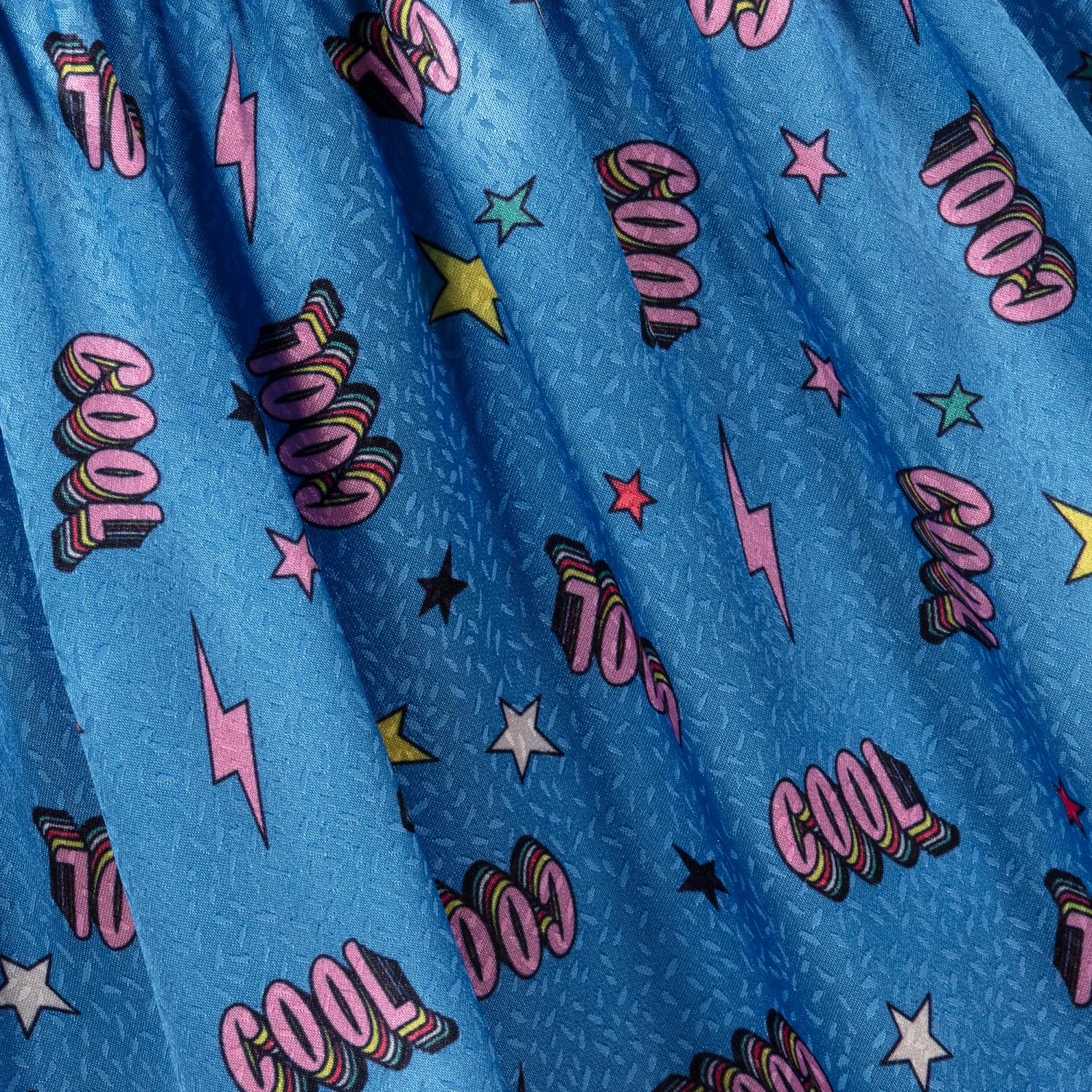 Blue dress for girls by Billieblush, made in a lightweight satin. It is patterned with colourful stars and the word ‘Cool’ in pink. Lined in cool viscose, it has elasticated cuffs on the sleeves and fastens with a concealed zip on the back.