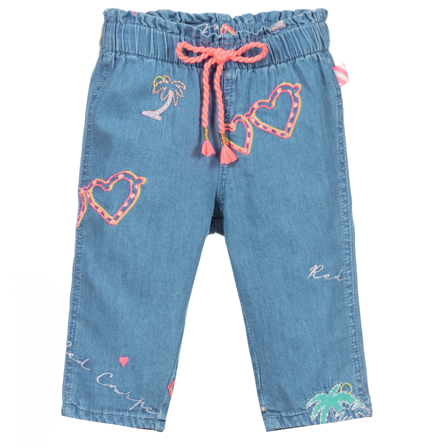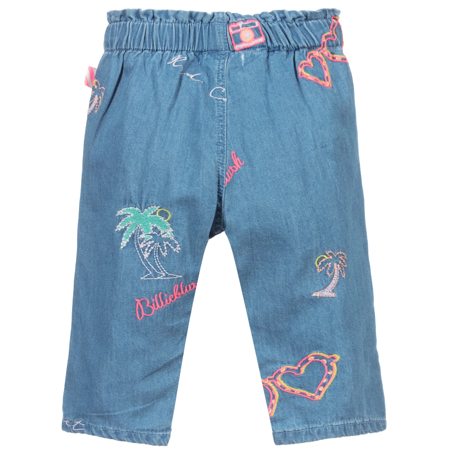 Sweet blue trousers for little girls by Billieblush, made in soft cotton chambray. They have an elasticated waistband with faux neon pink tie detail and are patterned with embroidered trees, hearts and logos in bright neon colours.