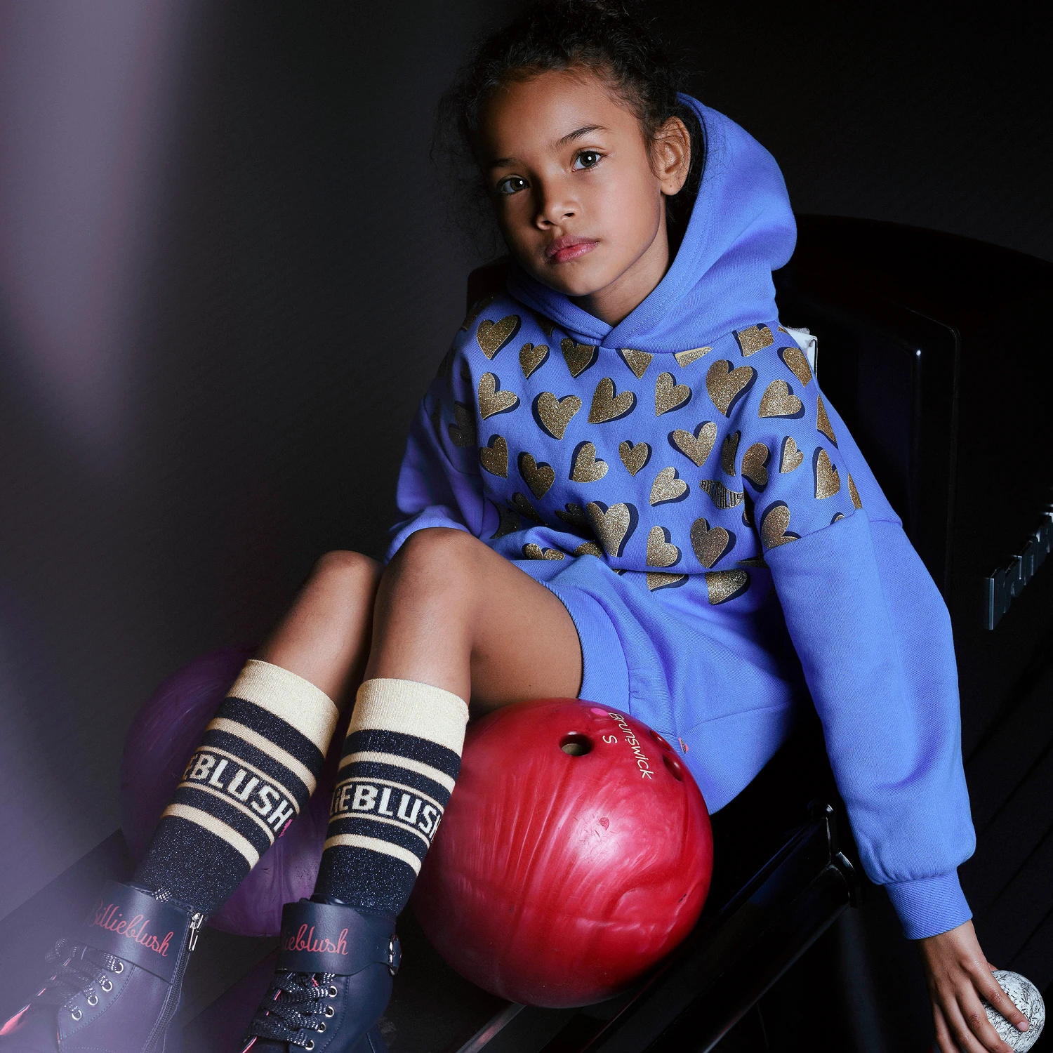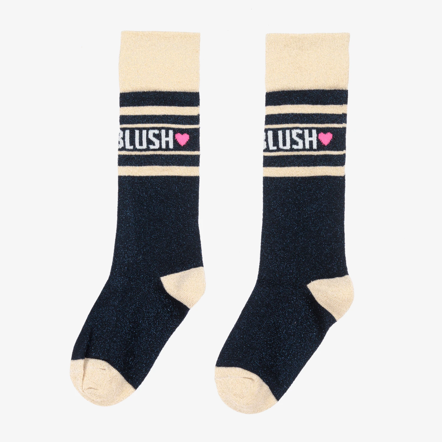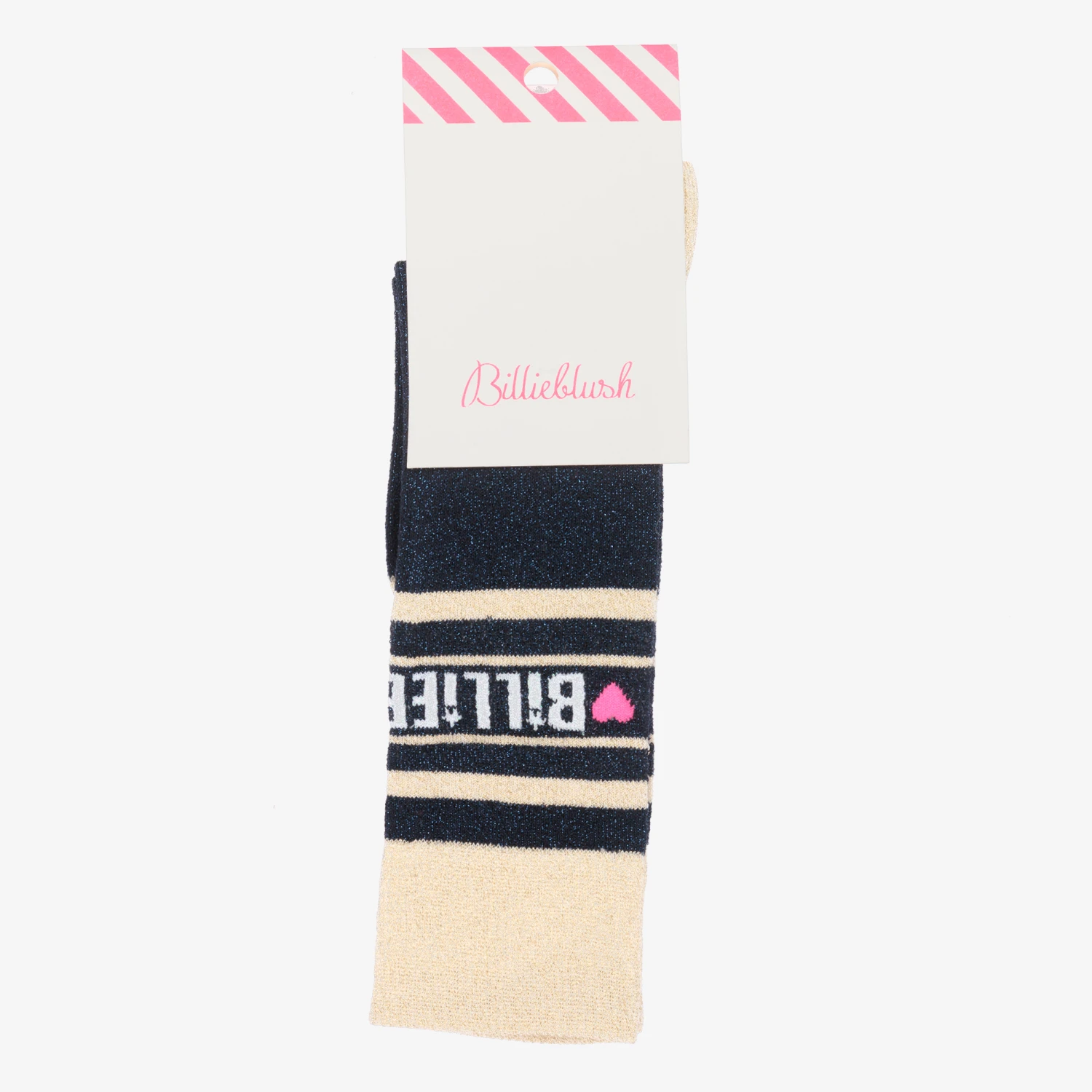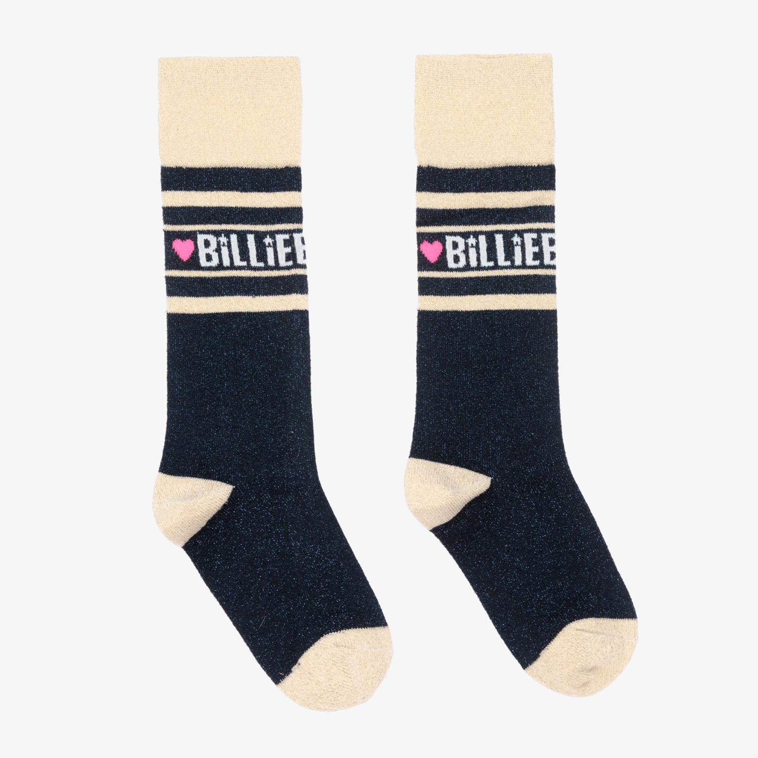 Fun socks for girls by Billieblush, with navy blue and gold glitter stripes. Made in a soft and stretchy cotton blend, they are patterned with the brand’s logo in white.