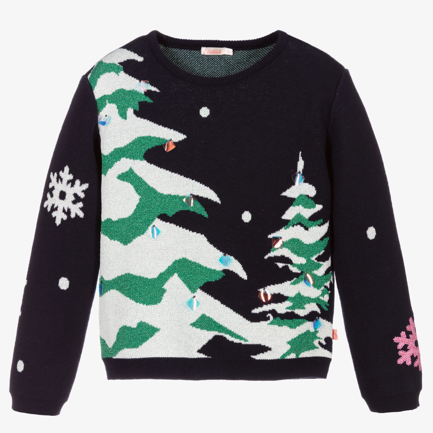 Navy blue sweater for girls by Billieblush, knitted in a soft viscose and cotton blend. It has a festive design of snow-covered Christmas trees, with iridescent sequins, and pink and white snowflakes.