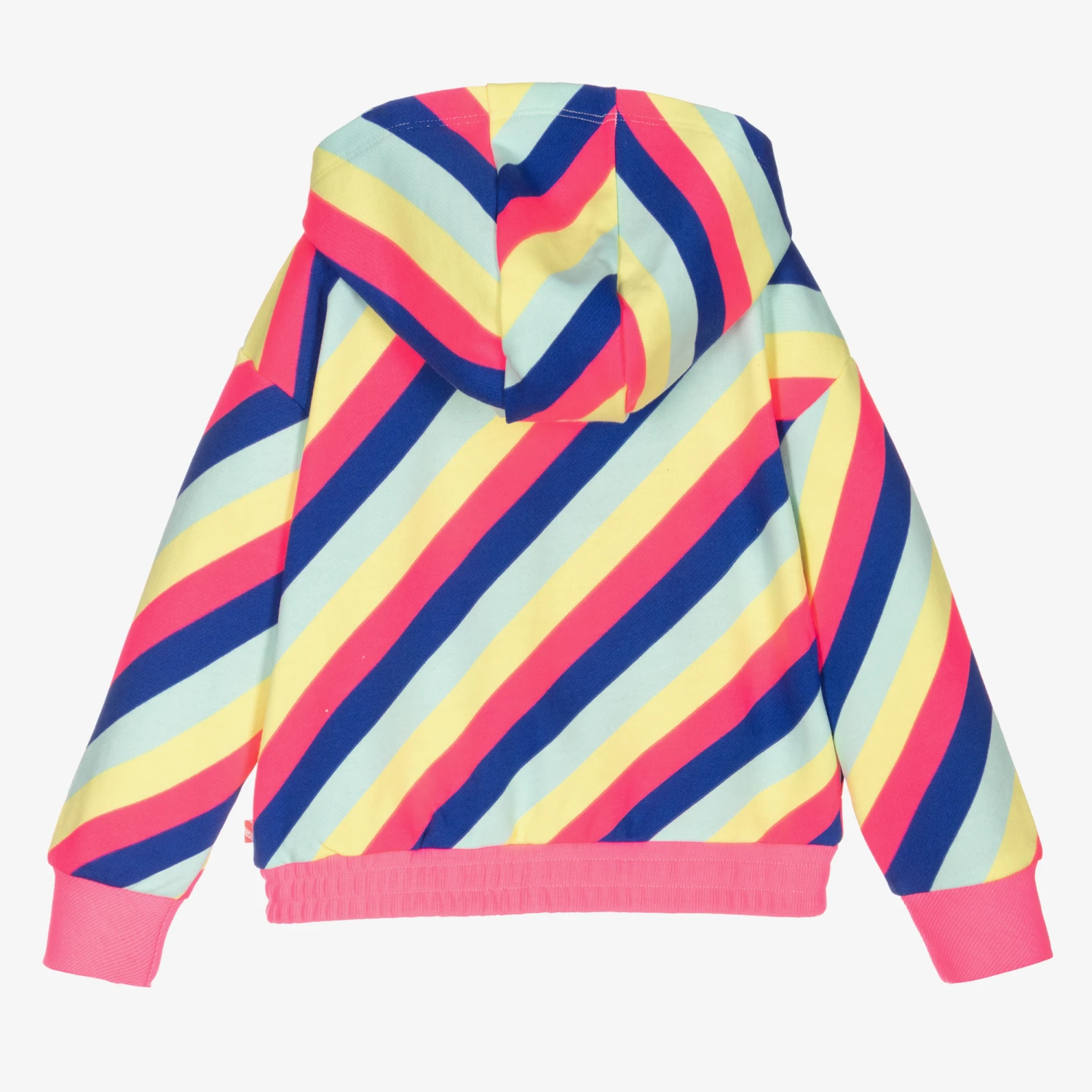 Zip-up hoodie for girls by Billieblush, striped in navy blue, turquoise, yellow and neon pink, the brand’s signature colour. Made in comfortable cotton sweatshirt jersey, it has a rubberised pink logo on the front and useful concealed side pockets.