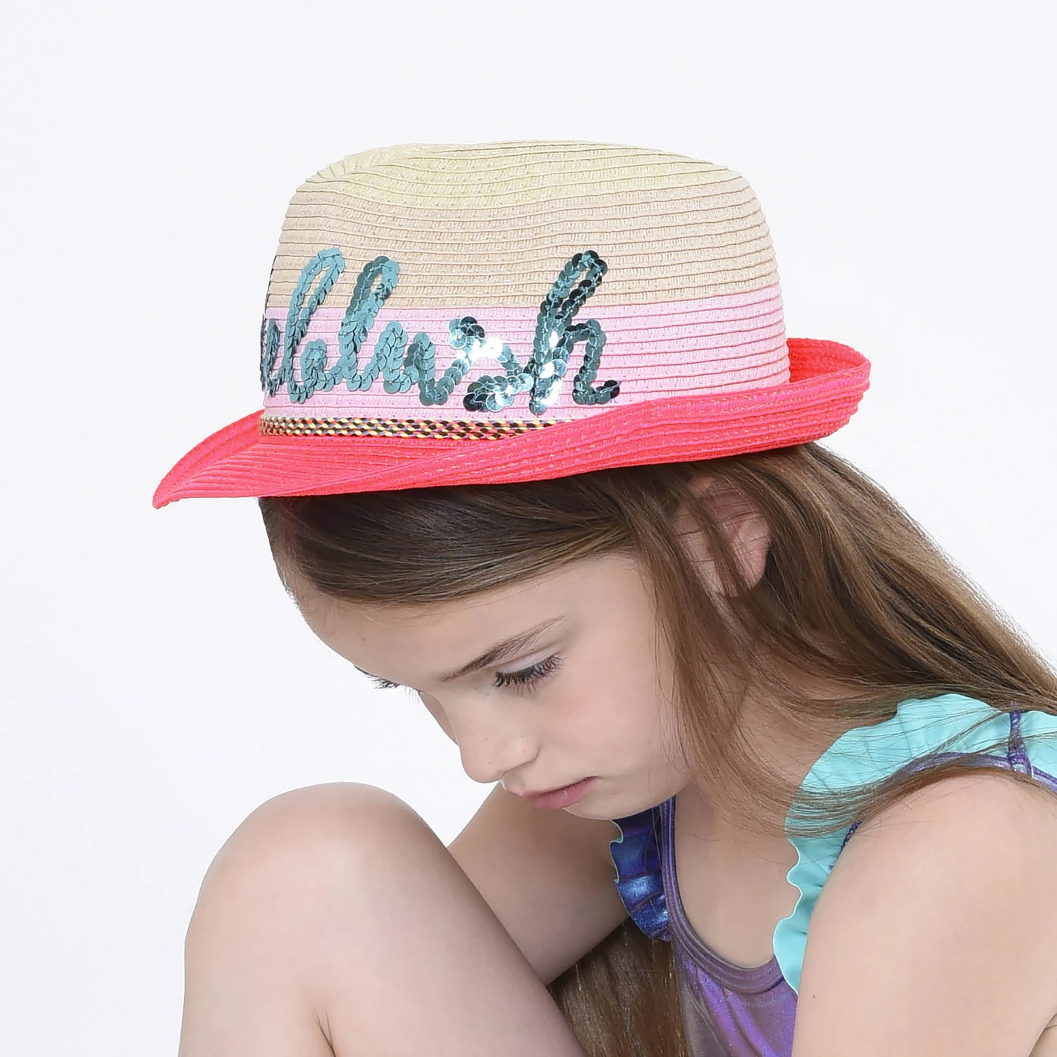 Beige and pale pink straw hat for girls by Billieblush. It has a bright neon pink brim, with a colourful rope band, and the brand’s name in eye-catching shiny blue sequins. This fun trilby style is trimmed with the brand’s signature striped tab, and has neon pink neck tape on the inside for added comfort.