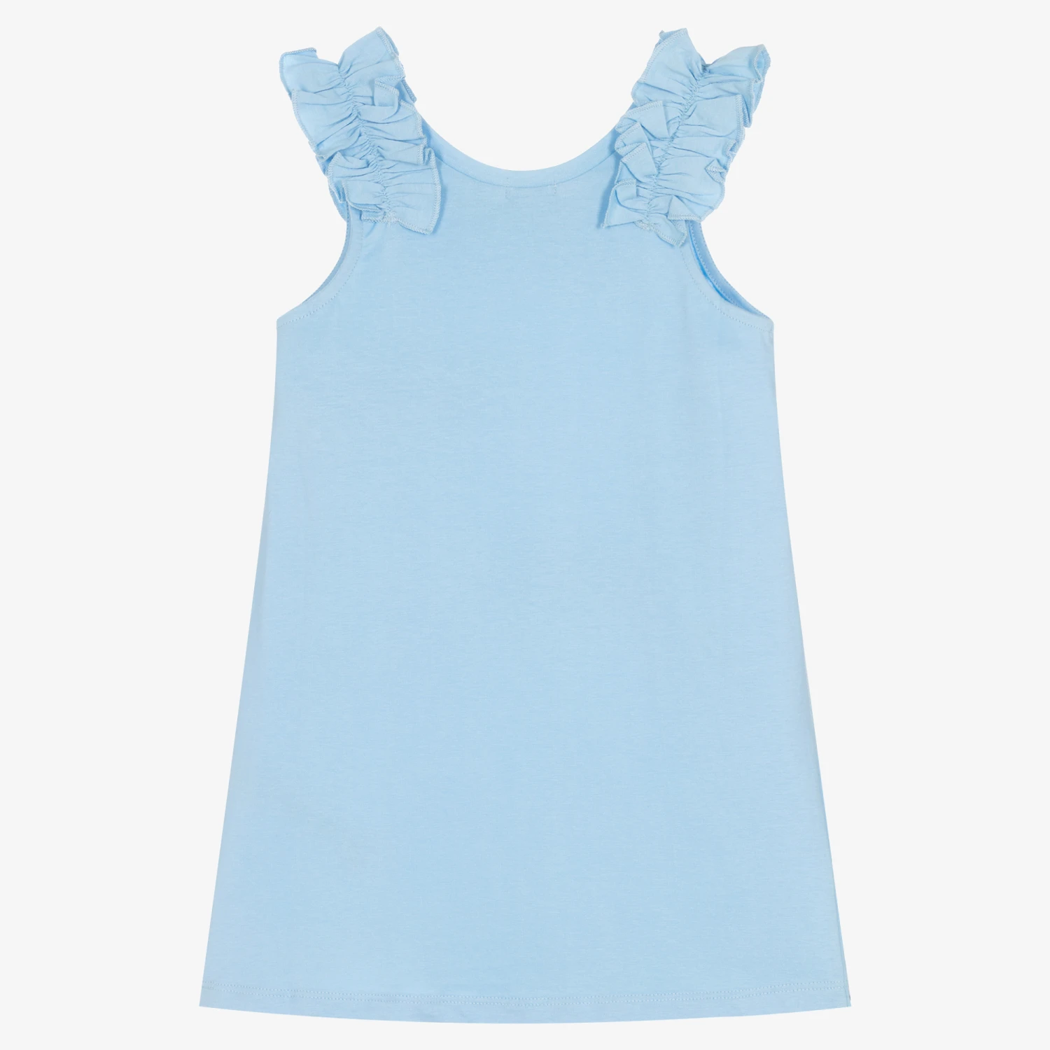Cute and casual, blue cotton dress for girls by Billieblush. It has brightly coloured parasols printed on the front that are embellished with neon yellow sequins and feminine ruffle detailing on the shoulder straps. The brand’s iconic striped tag is on the side for a designer finish.