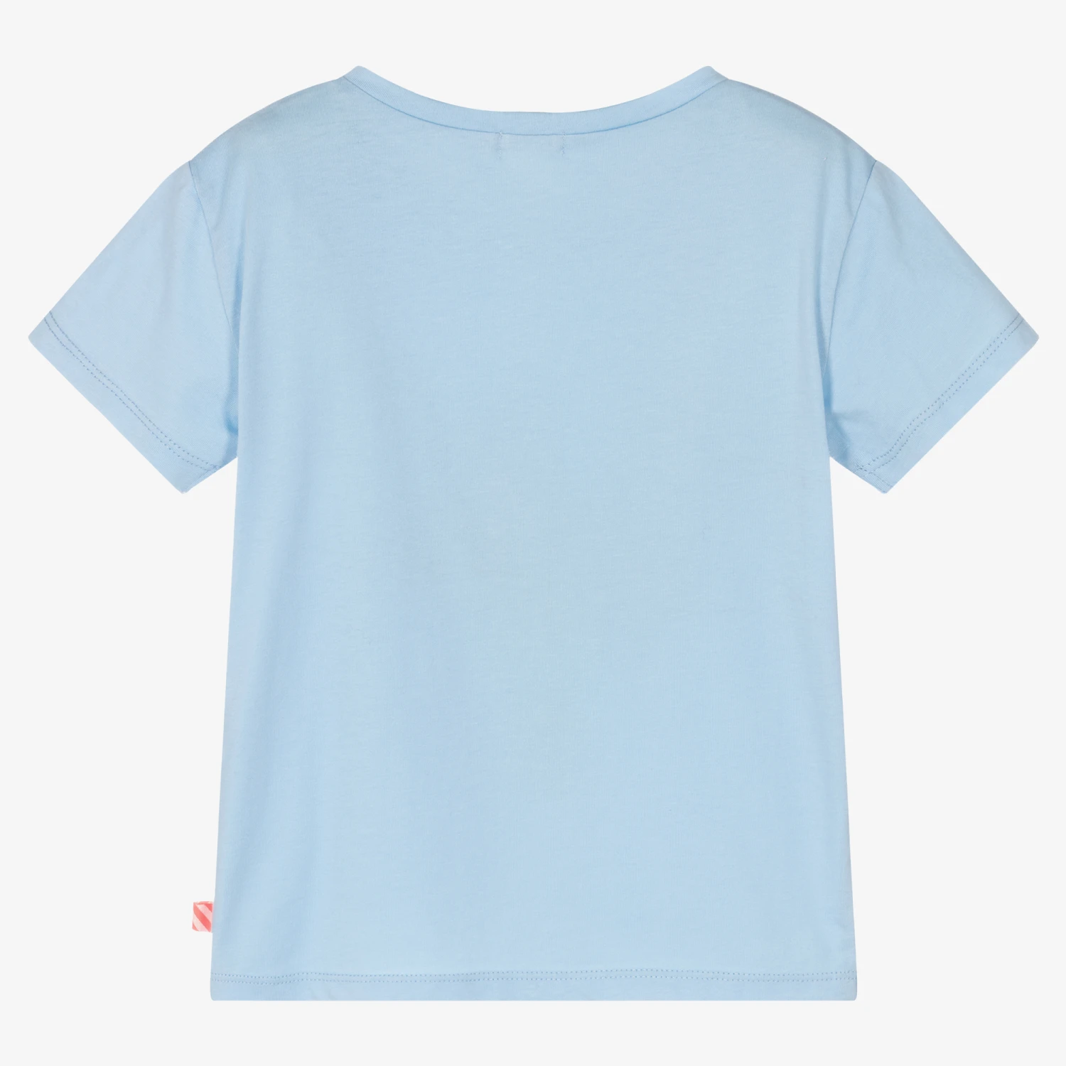 Pale blue cotton T-shirt for girls by Billieblush, with a glittery pink and green unicorn on the front, trimmed in white pearl beads. It is made in comfortable jersey, so is both eye-catching and comfortable. It has the brand’s signature logo tab on one side seam.