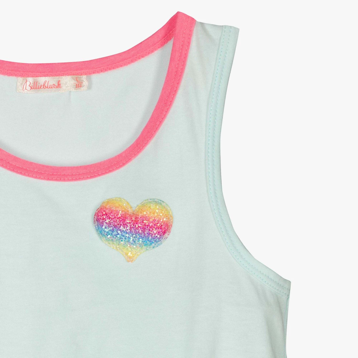 Pale blue vest top for girls by Billieblush. Made with soft and stretchy cotton jersey, it has a neon pink neckline, a tie detail on the hem, and a glittery padded heart in rainbow colours on the chest.
