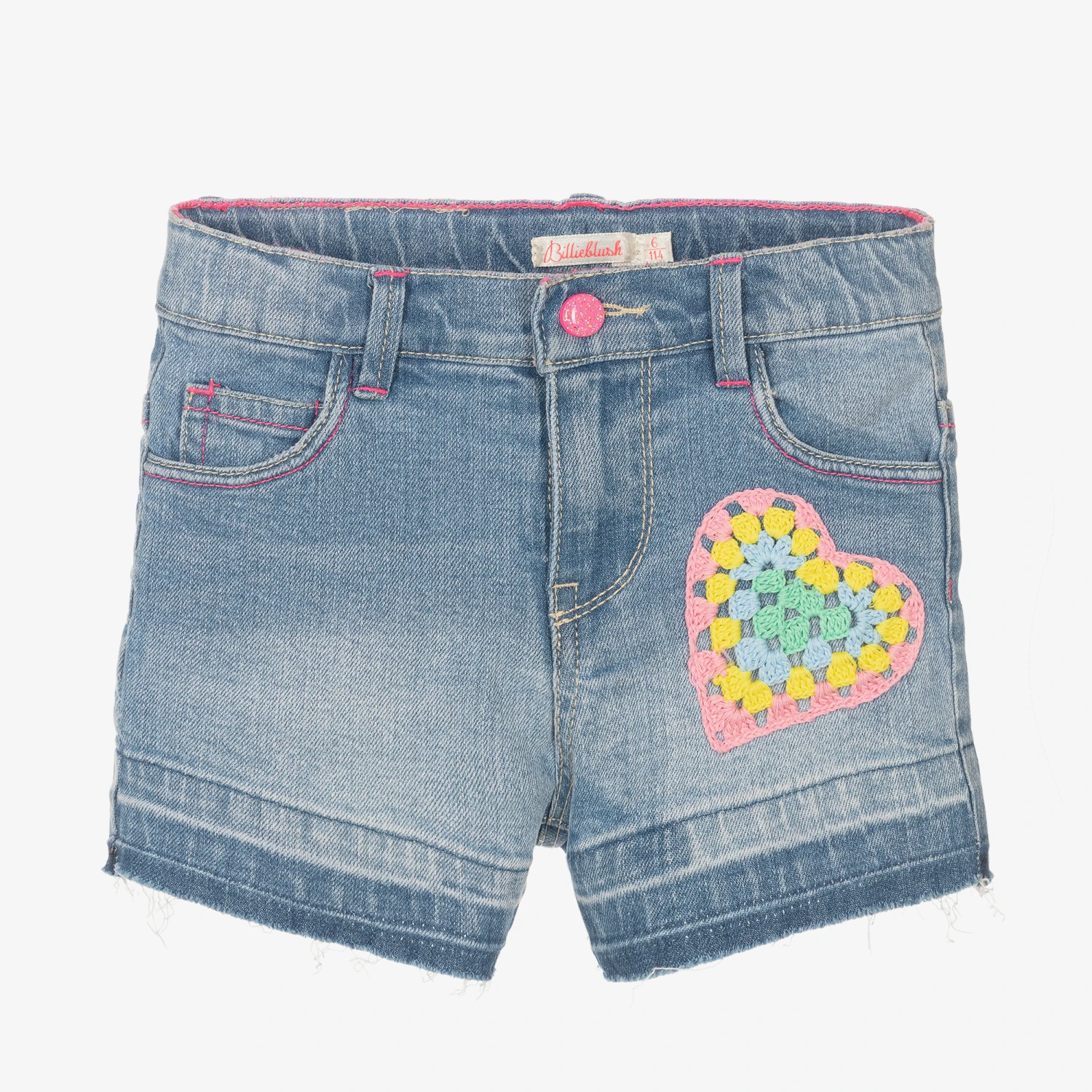 Cute blue shorts for girls by Billieblush, made in soft cotton denim with a slight stretch. For an edgy yet girly look, they have a sparkly pink button fastening with a zip, a colourful crocheted heart on the leg and distressed hems. They have classic five-pocket styling with exposed neon pink stitching, and a rubberised glitter logo on the back. They have an adjustable waist for an ideal fit.