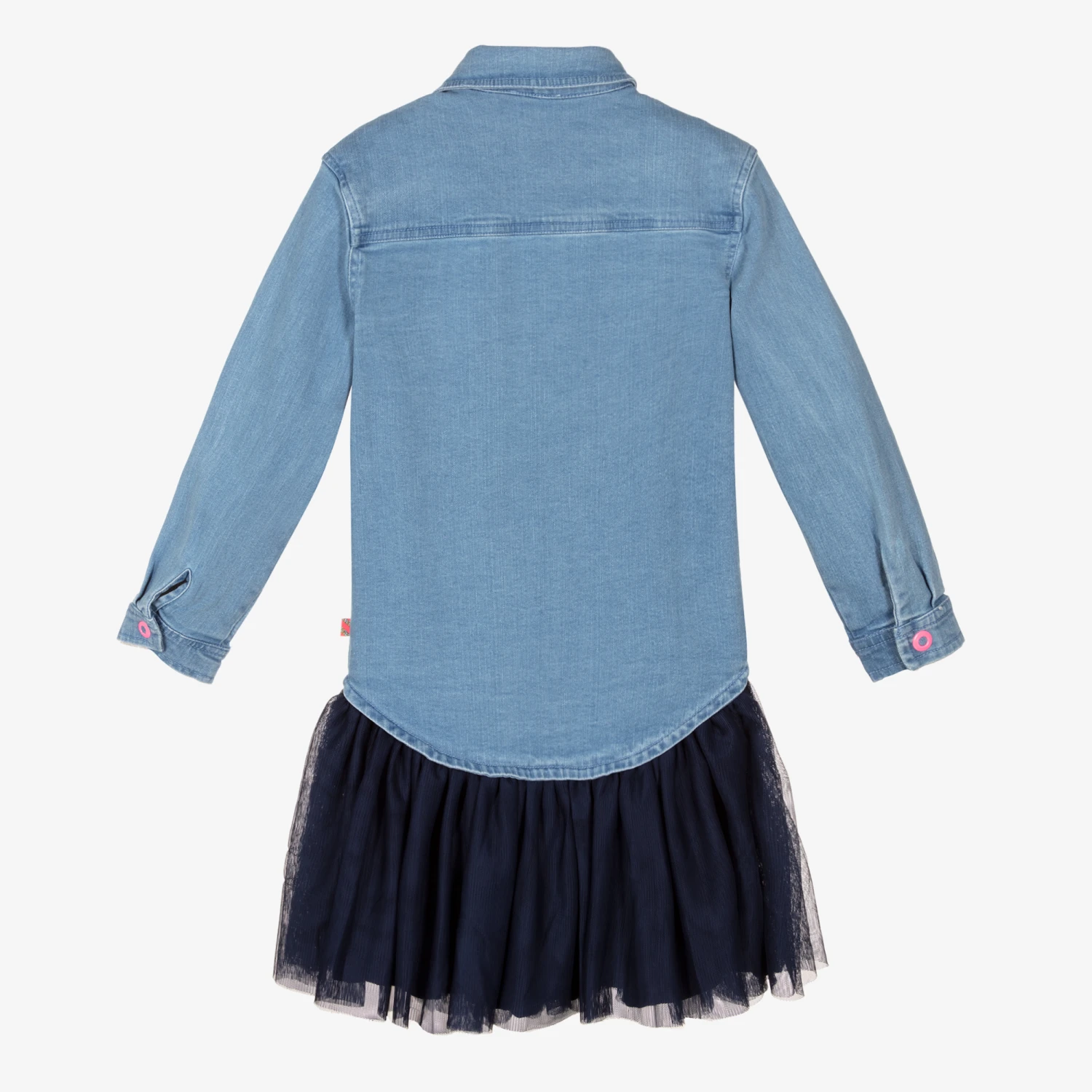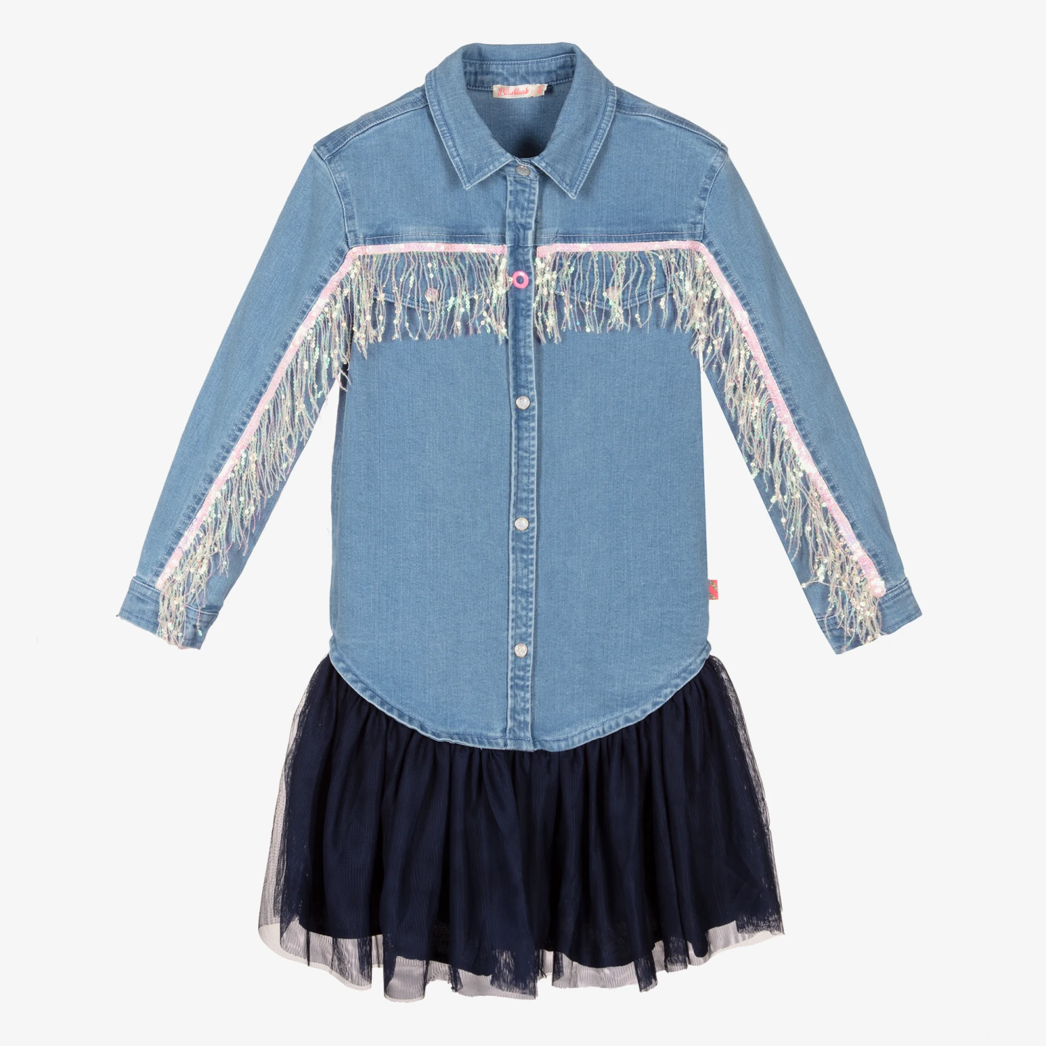 Quirky blue denim shirt dress for girls by Billieblush, with a navy blue tulle skirt. Fastening with sparkly poppers on the front, it has pretty pink sequin fringing across the front and sleeves and a neon pink logo tab on the side seam.