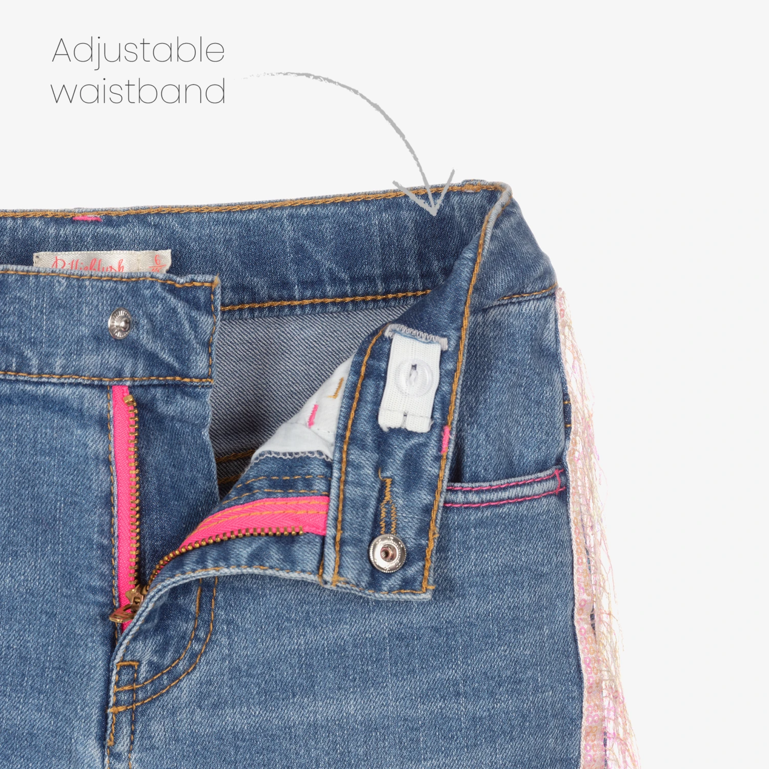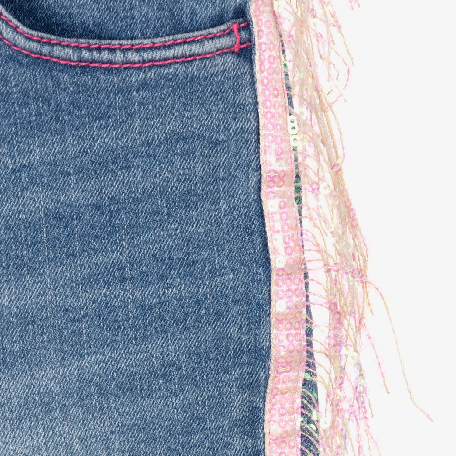 Cool mid-blue skinny jeans for girls by Billieblush, with stunning pink sequin fringing on the sides. In a classic five pocket style, they have heart embroidery on the back and a glittery logo tab on the back waistband. There are stitched in turn-ups on the ankle cuffs, with stylish frayed hems. Fastening with a zip and popper, they have an adjustable waist for a good fit.