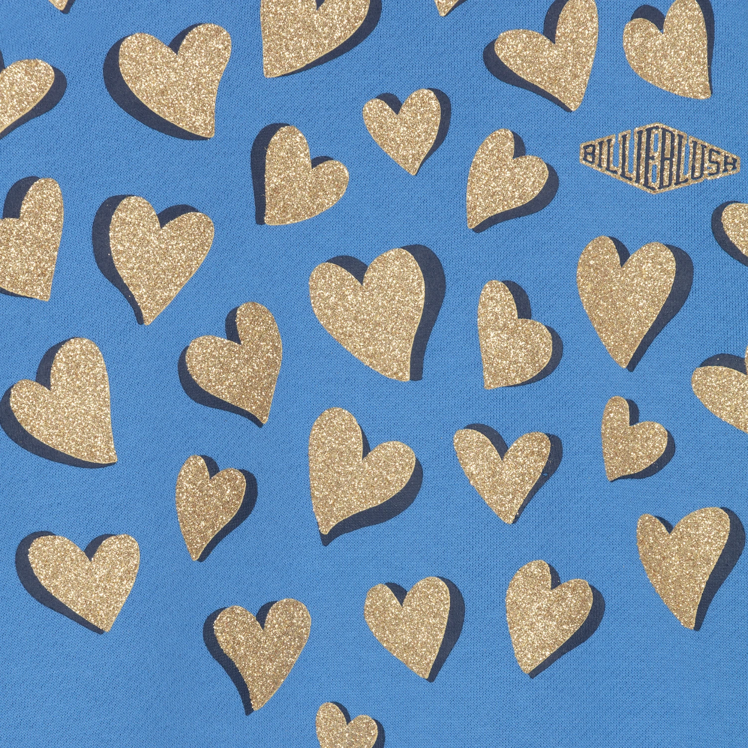 Casual blue hoodie dress for girls by Billieblush, made in soft sweatshirt jersey, with a fleecy inside. Printed with a sparkly gold hearts design, it has the brand’s logo printed on the chest in black and gold, and stretchy ribbed cuffs.