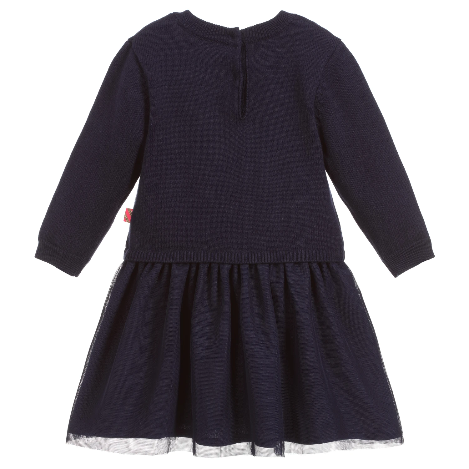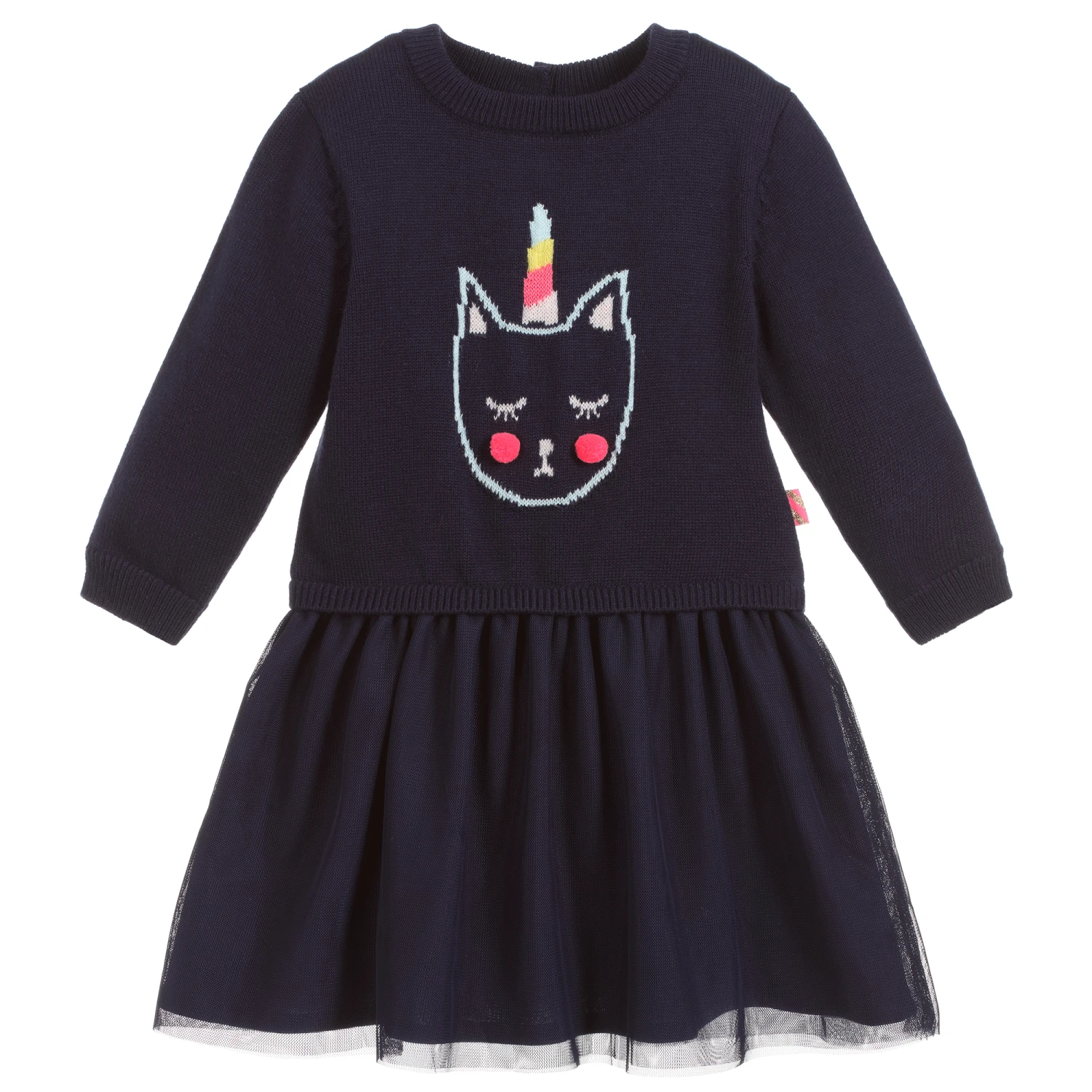 Sweet navy blue dress for little girls byΒ Billieblush. It has a knitted bodice with a cute unicorn cat on the front. The skirt is made in a double layer of soft tulle, with a lightweight jersey lining.