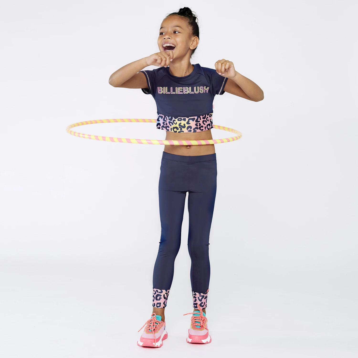 Navy blue leggings for girls by Billieblush, made in stretchy sports jersey. There is contrasting neon pink stitching and the cuffs are trimmed in pink, blue and yellow leopard print.