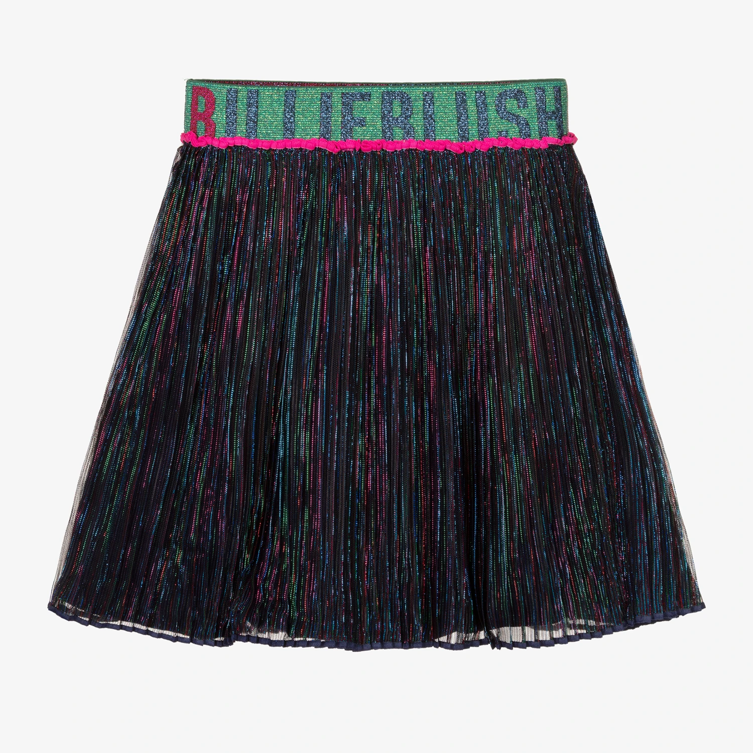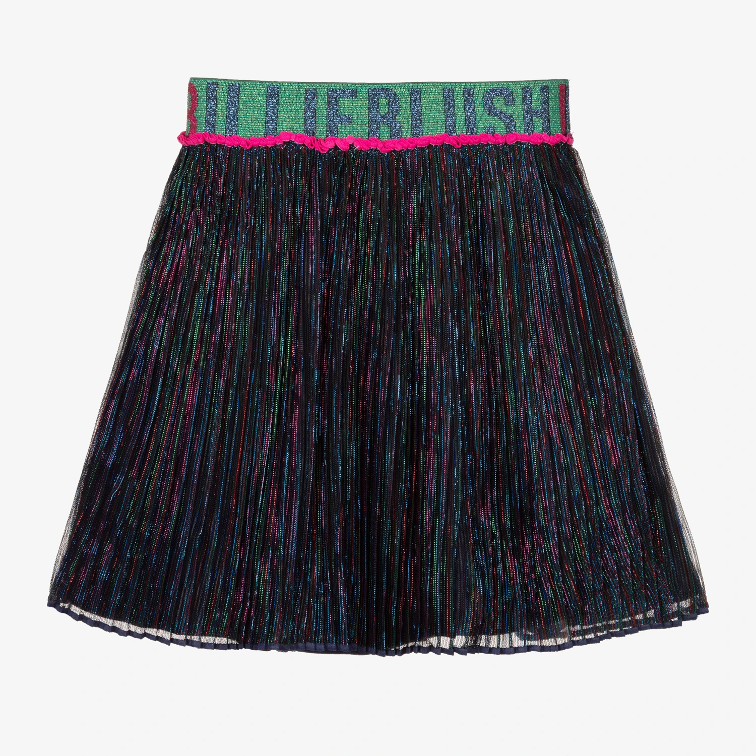Girls pleated skirt by Billieblush, made with metallic lurex in red, green and blue. It has an elasticated, glittery jacquard logo waistband with a neon pink trim. There is a silky soft viscose lining for comfort.