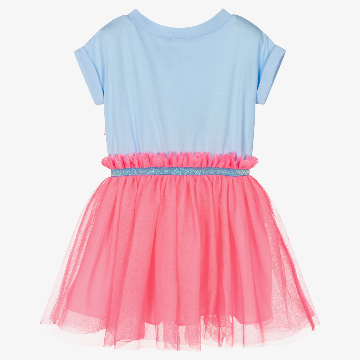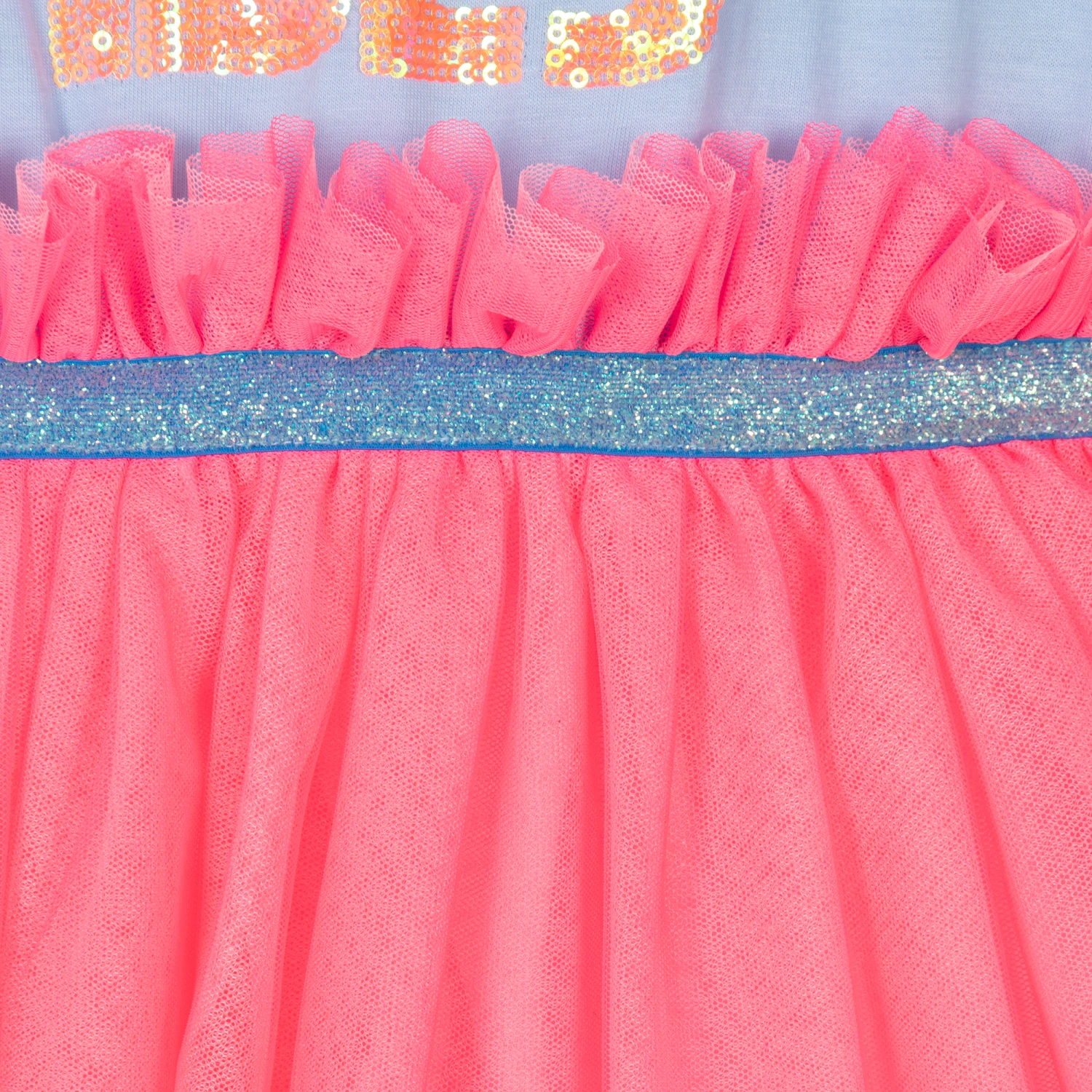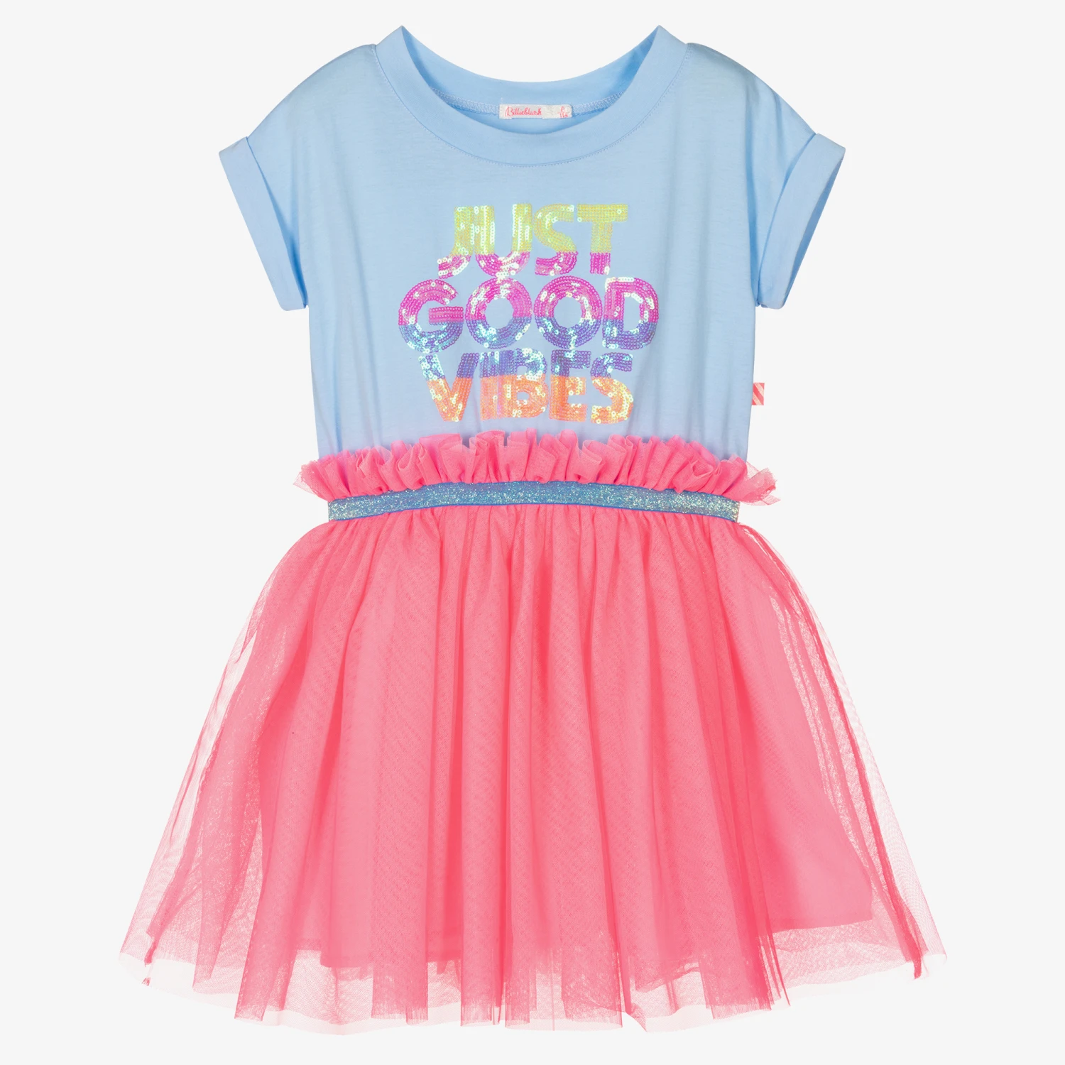 Fun dress for girls by Billieblush, with a ‘Just Good Vibes’ slogan shimmering in colourful sequins on the front. It has a pale blue bodice with cute turn-up cuffs, made in comfortable jersey. The gathered, neon pink tulle skirt has a stretchy, glittery blue waistband and is lined in pink voile for comfort. Easy to wear, it simply pulls on.