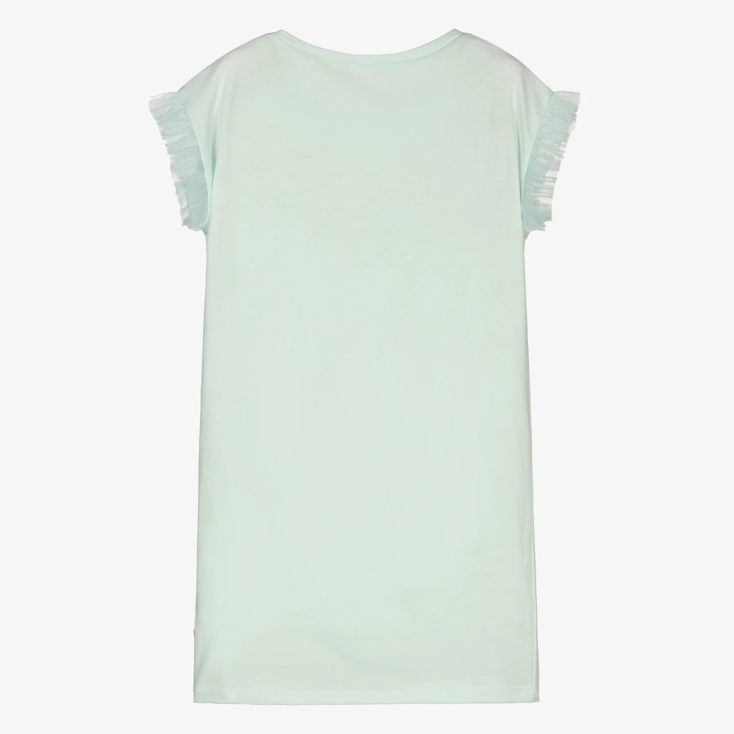 Pale blue cotton dress for girls by Billieblush. Made with soft and stretchy jersey, it has a striped pink, orange and green graphic, with ‘Girls Team’ in white glitter, star prints, and a fabric star appliquΓ© with pink ribbon tassels. There are pretty tulle short sleeves and a striped logo tab on the side seam.