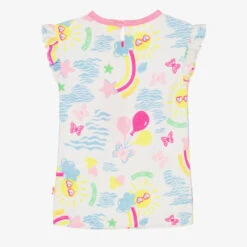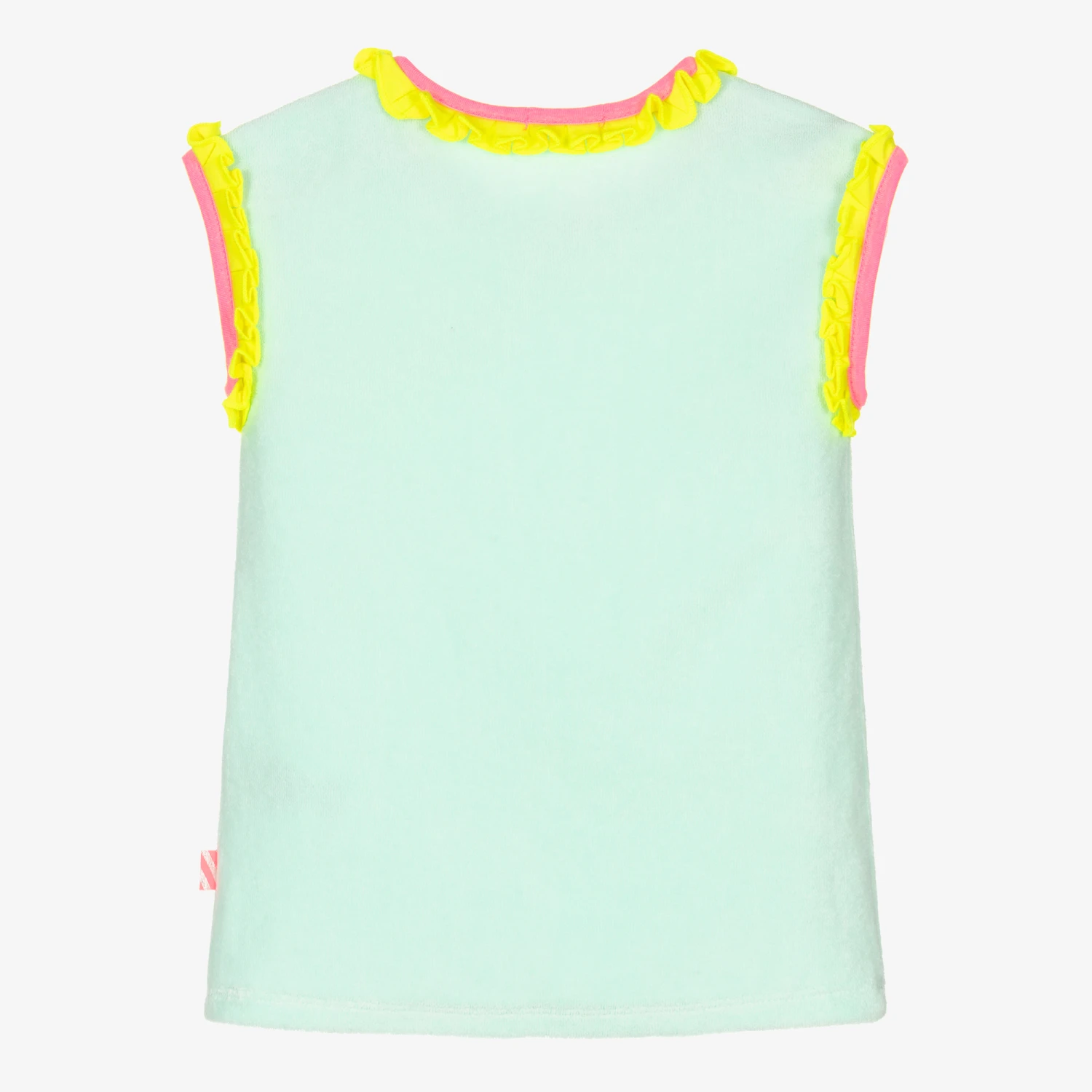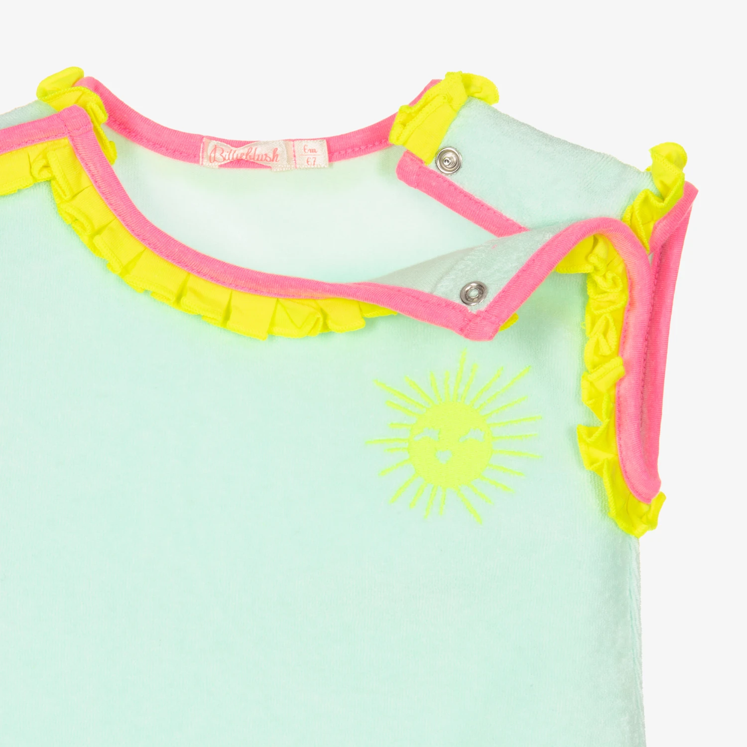 Pale blue dress for little girls by Billieblush. Made with soft and stretchy cotton towelling, it has neon pink trims, neon yellow frills, and popper fastenings on both shoulders for ease when dressing.