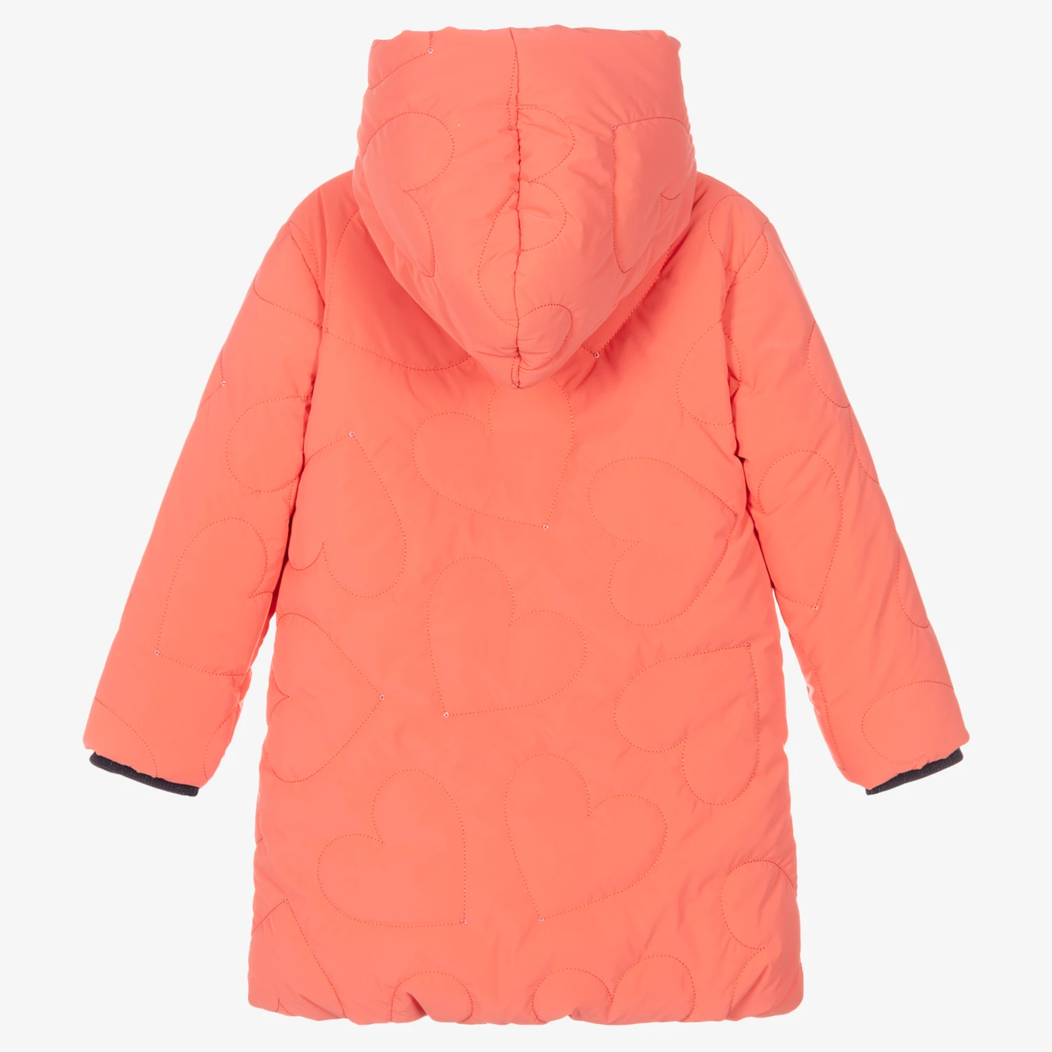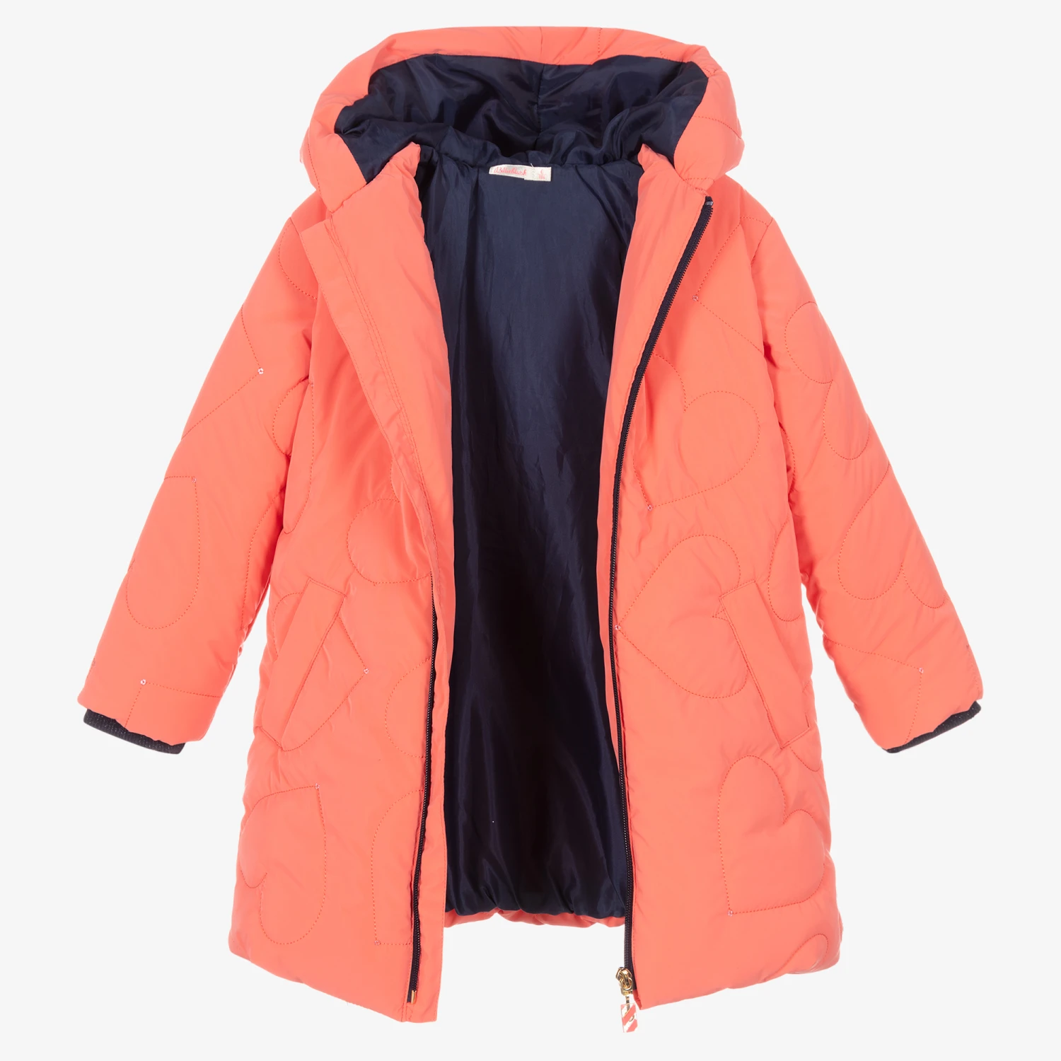 Coral pink coat for girls by Billieblush. Made in smooth polyester, the fabric is quilted in love heart shapes each finished with a single sequin adding a sparkle to the coat. Warmly padded, it has a silky lining, front pockets and glittery navy blue ribbed cuffs to keep the warmth in. It fastens at the front with a navy blue zip.