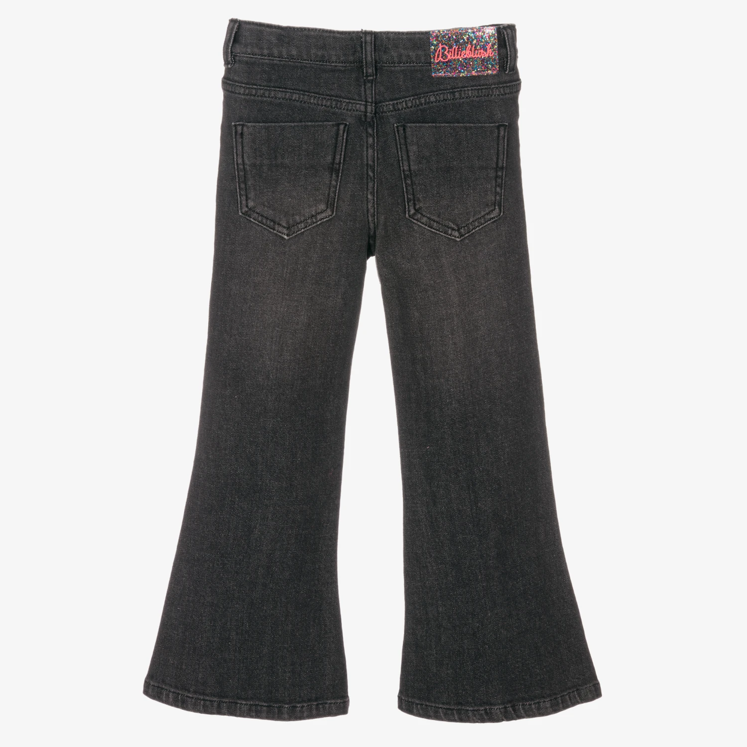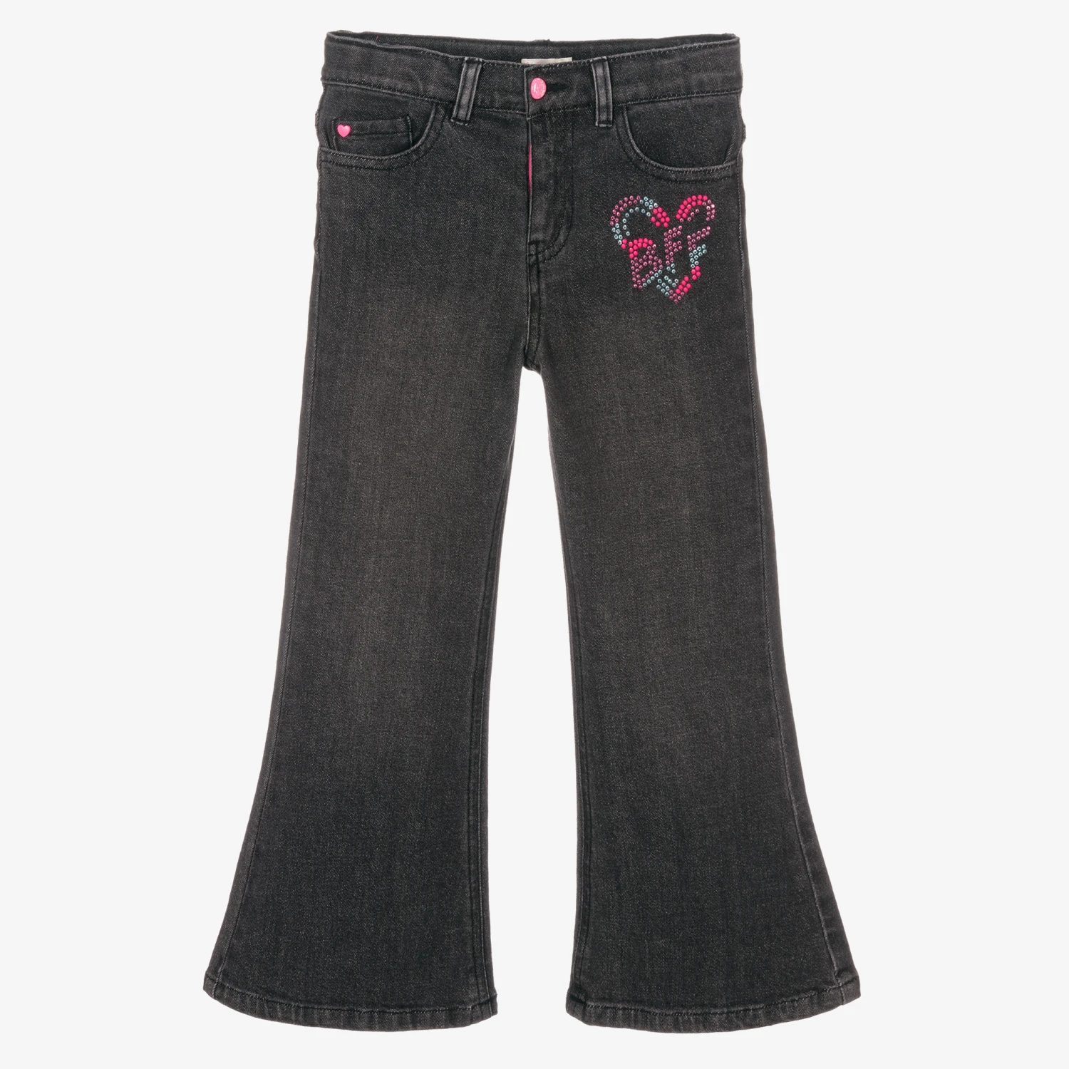 Washed black jeans for girls by Billieblush, made in soft cotton denim. With a cool, flared cut, they are trimmed with a diamanté heart and glittery rubberised logo badge on the back of the waistband. They have five pockets, a useful adjustable waist and a pink front popper and zip fastening.
