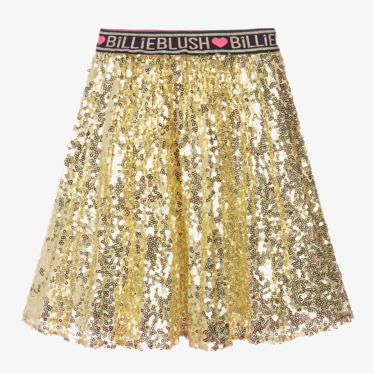 Ideal for a party, a gold sequin skirt for girls by Billieblush. Lined in super soft viscose, it has a stretchy navy blue logo waistband with fun sparkly trims, and a neon pink logo tab on the side seam.