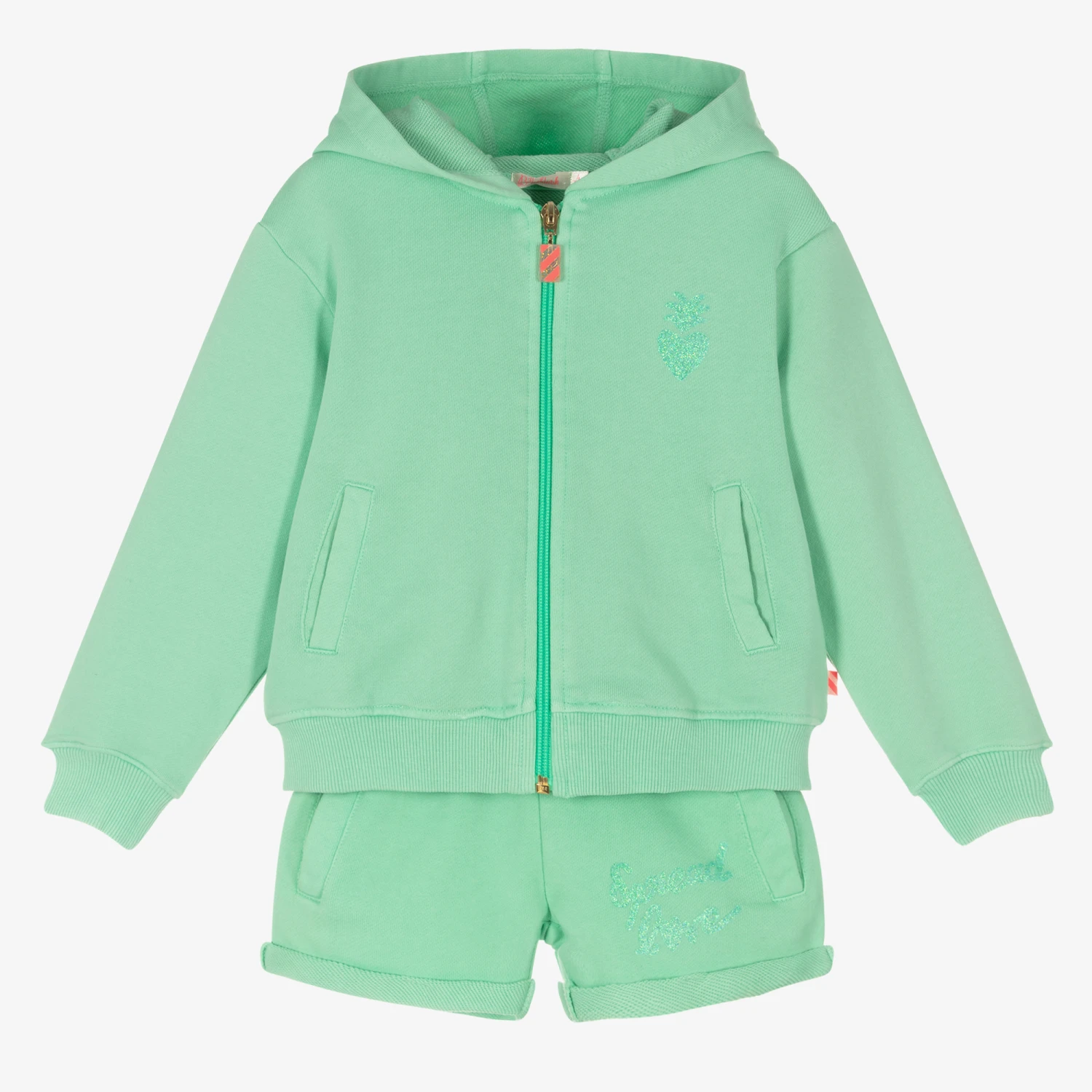 Short green cotton tracksuit for girls by Billieblush, just right for adding a little sparkle to casual days. Made in comfortable jersey, the hooded, zip-up top has a heart-shaped pineapple on the front and ‘Spread Love’ on the back, all in tonal green glitter. The shorts have matching script on one leg, with a stretchy, elasticated waist, useful side pockets and fixed turn-ups. The brand’s distinctive, striped neon pink pull tab is on the zip, with coordinating tabs on the side seams of both pieces.