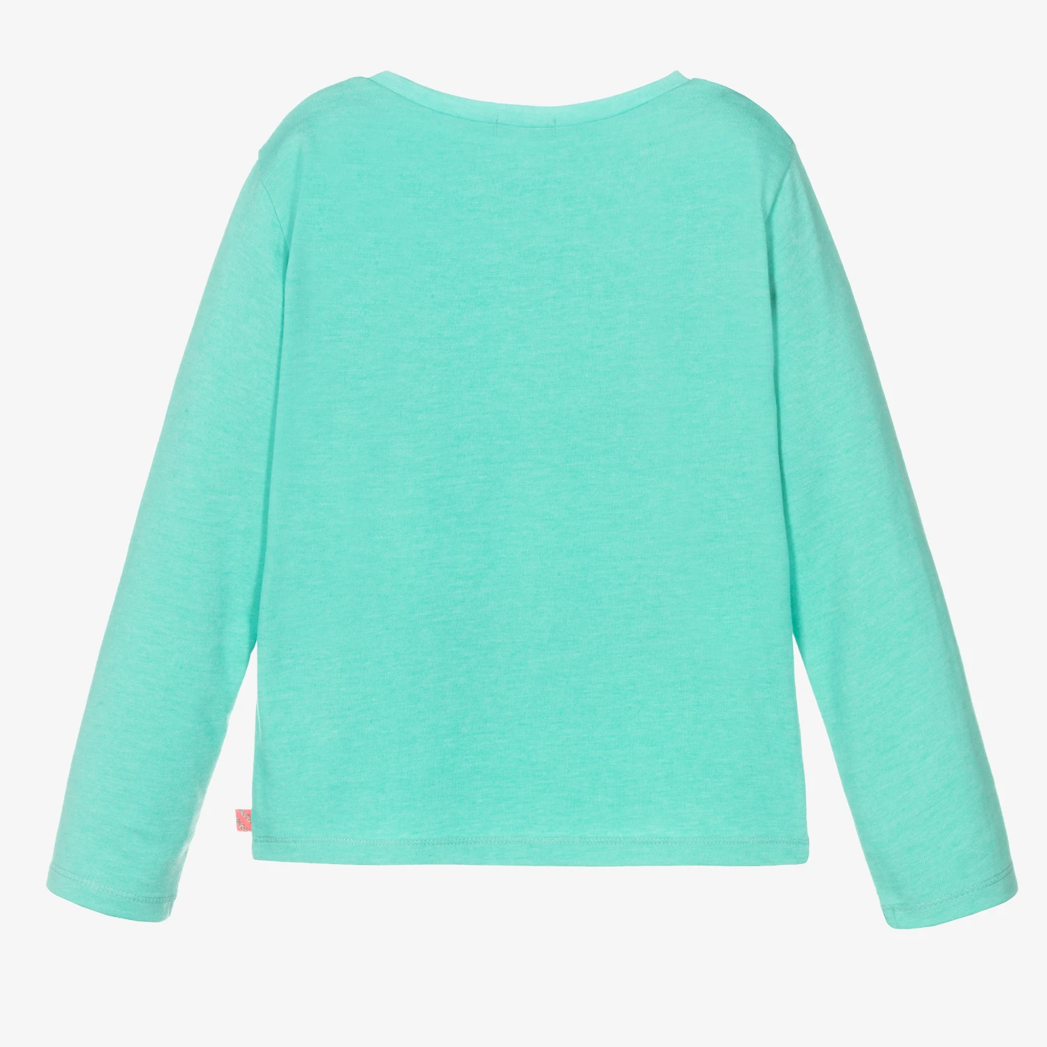 Bold aqua green top for girls by Billieblush, made in super soft polycotton jersey. It has a sparkly sequin logo print on the front in neon pink and gold.