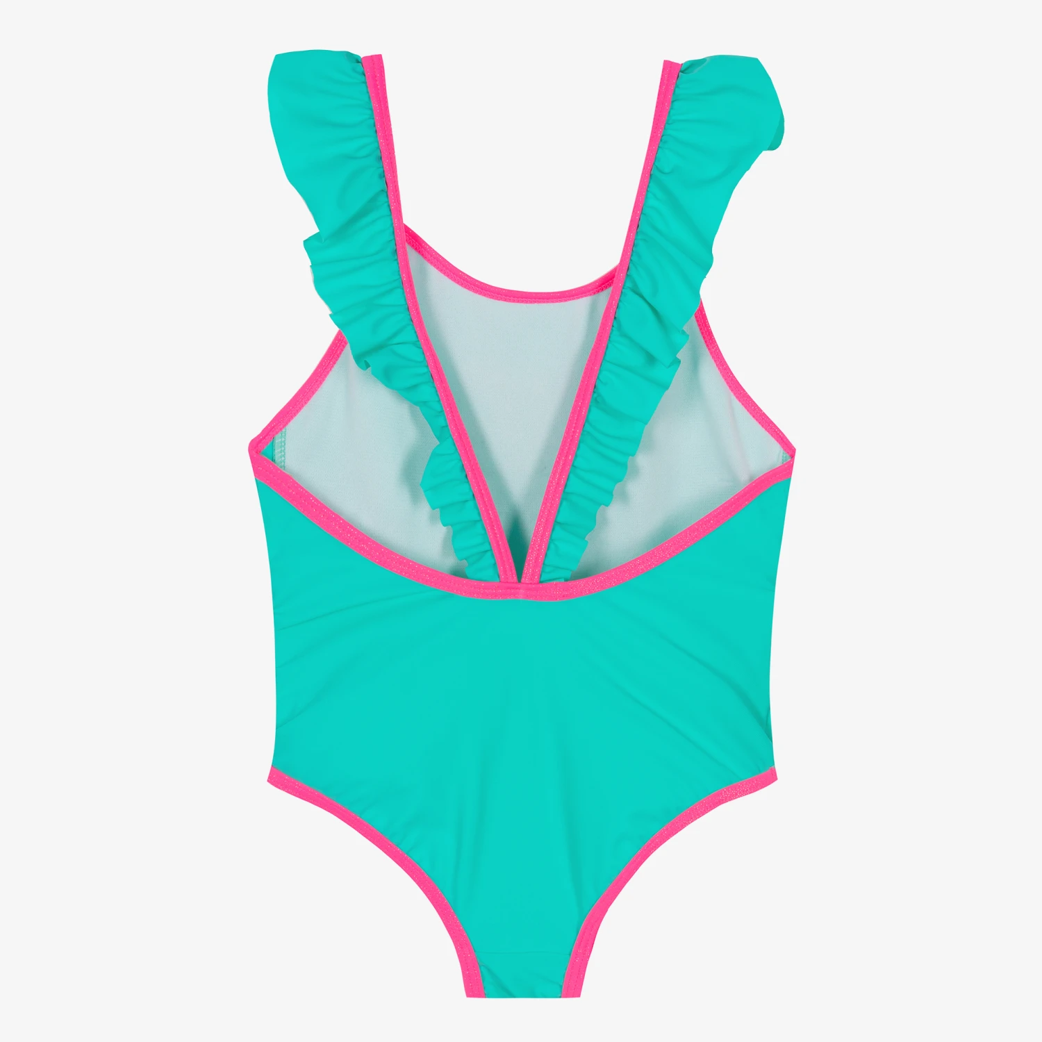 Vibrant aqua green swimsuit for girls by Billieblush, with a silky soft and smooth exterior. Tropical and summery, it has a colourful ‘Big Love’ slogan on the front, made with shimmering sequins. Ruffled shoulder straps and glittery neon pink trims create a stand-out beach style.