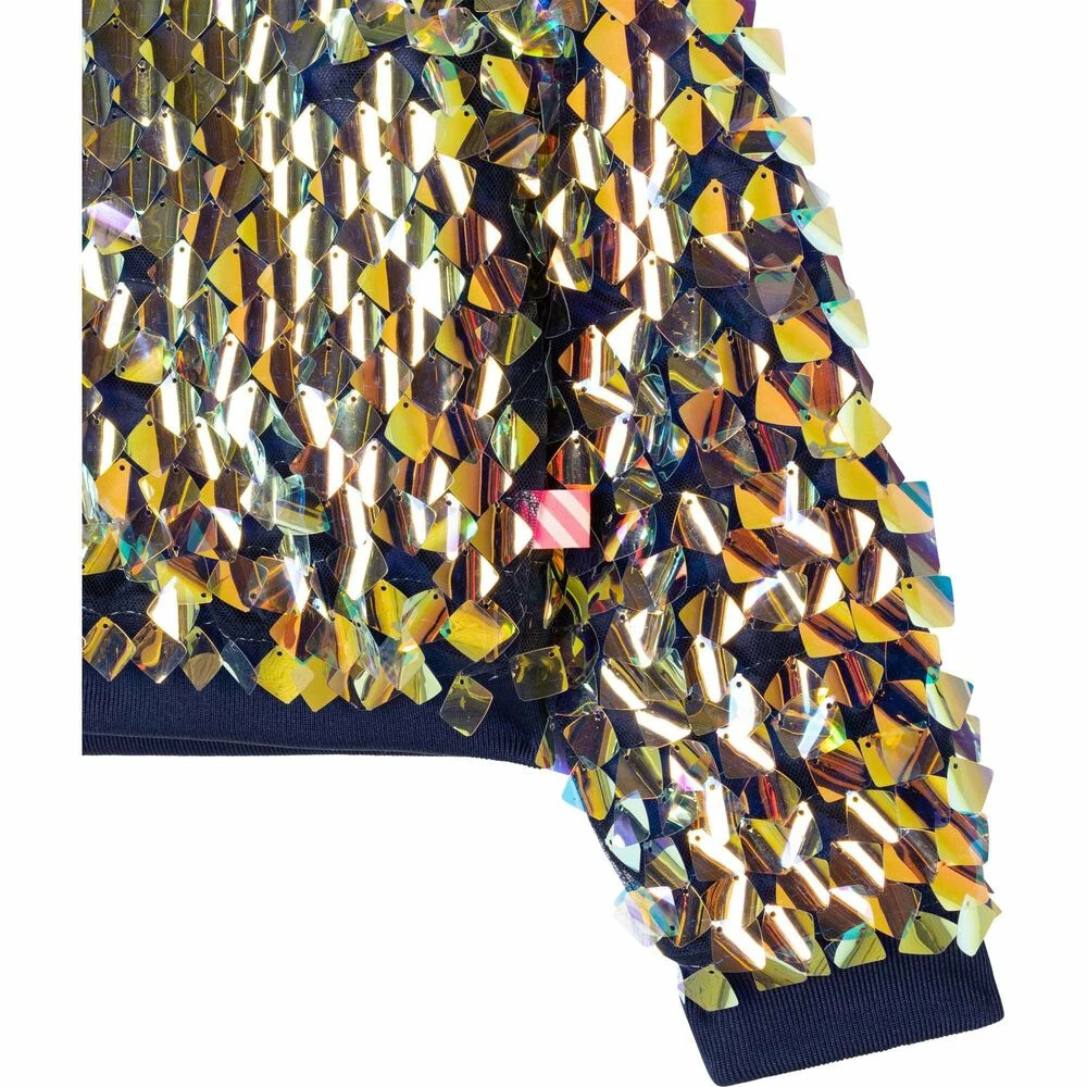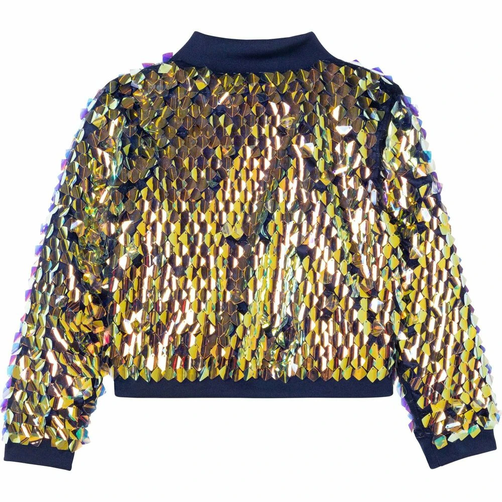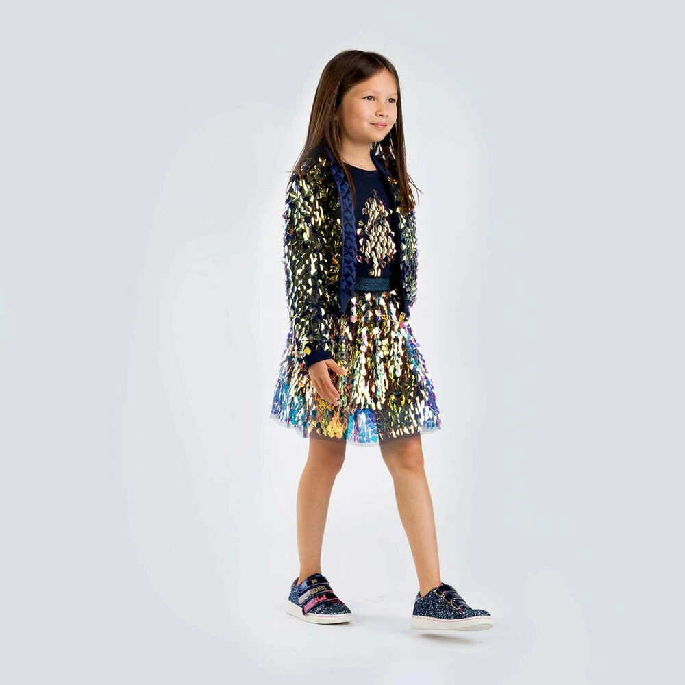 Stunning jacket for girls by Billieblush. Made from soft silky polyester, it features allover embellished large iridescent square sequins, has a gold zip to close with a pink heart attached. Matching skirt and top available to purchase separately.