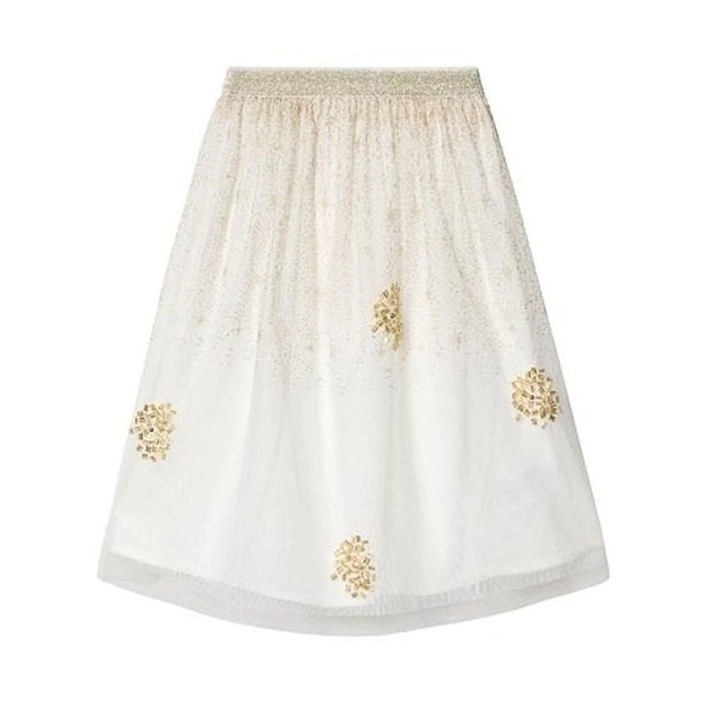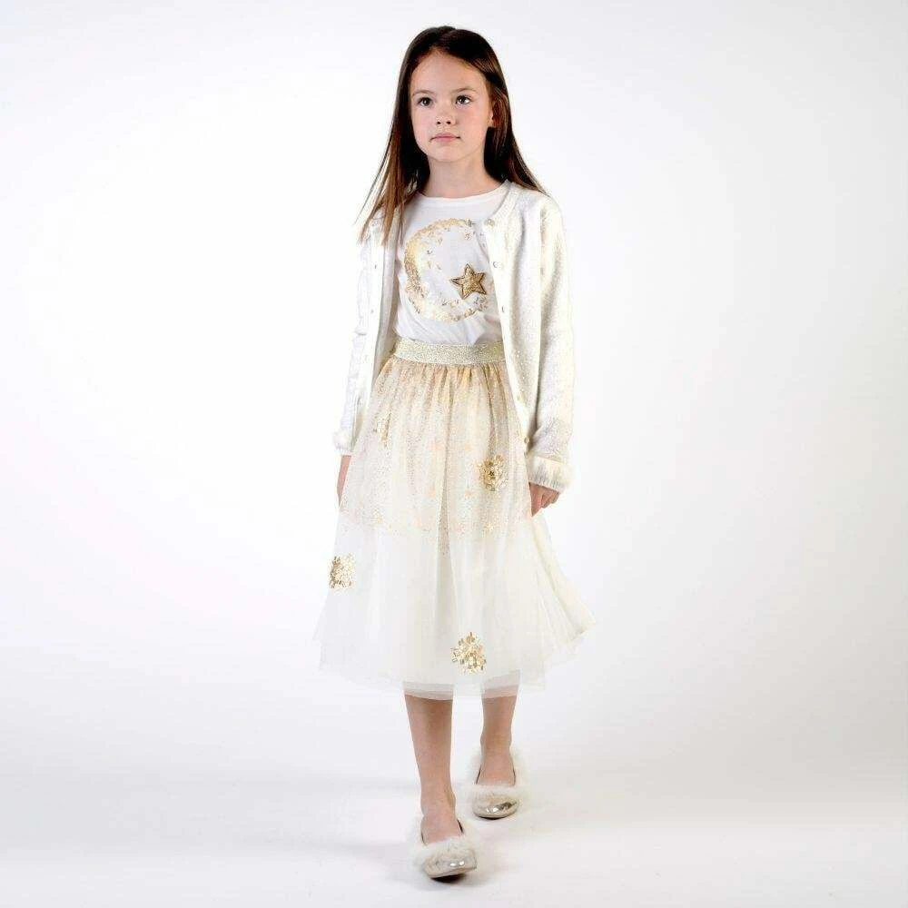 This ivory and gold knee length skirt by Billieblush is the perfect party piece. Made from layers of soft ivory tulle, it features printed gold stars and gold beading. It is fully lined in a lightweight viscose and has an shiny gold elasticated waistband.Â