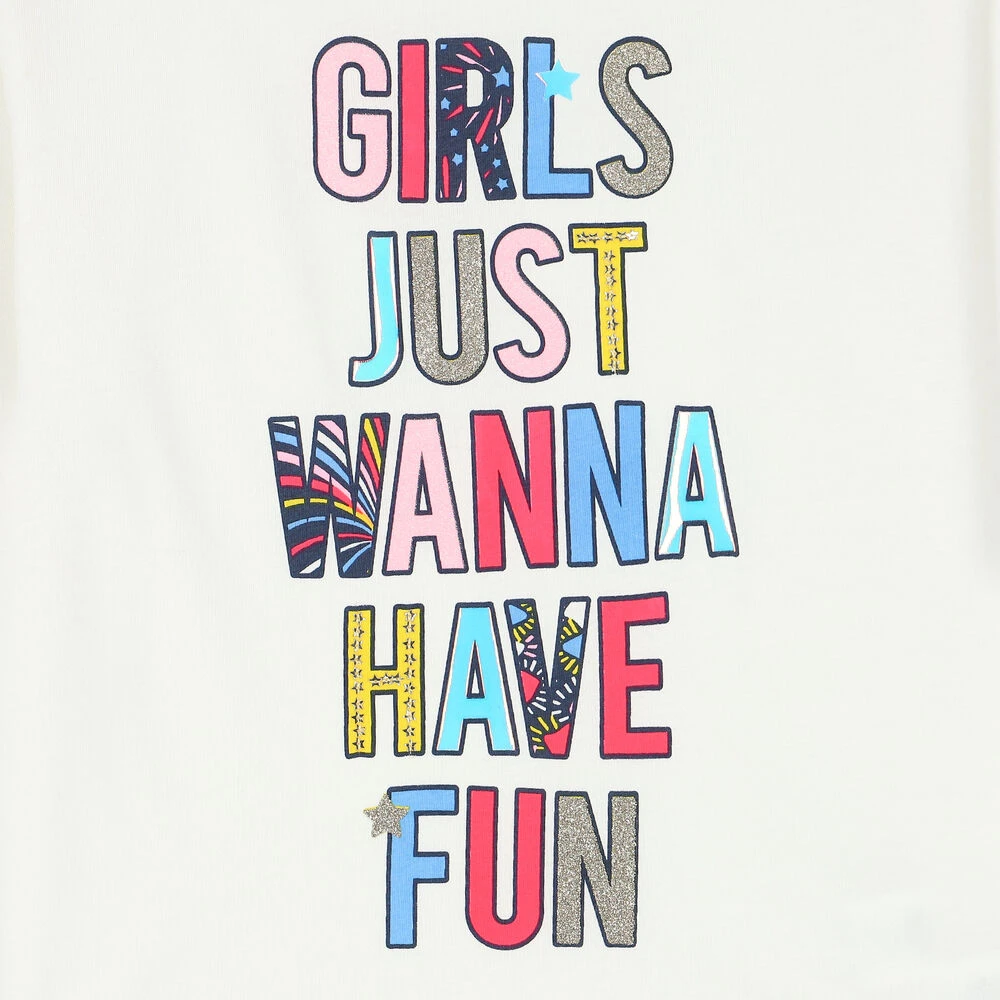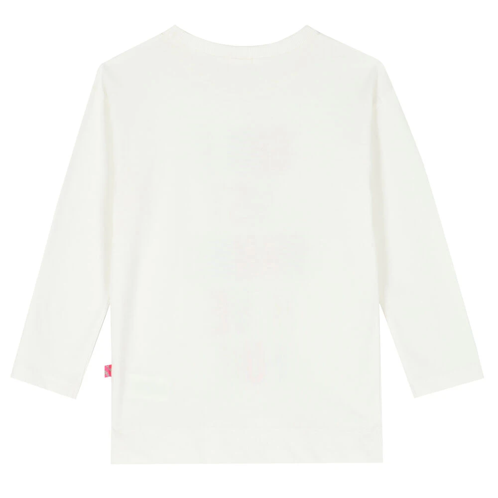 Ivory long sleeve top for girls by Billieblush. Made from soft cotton, it features colorful slogan print with sparkling glitters on the front.