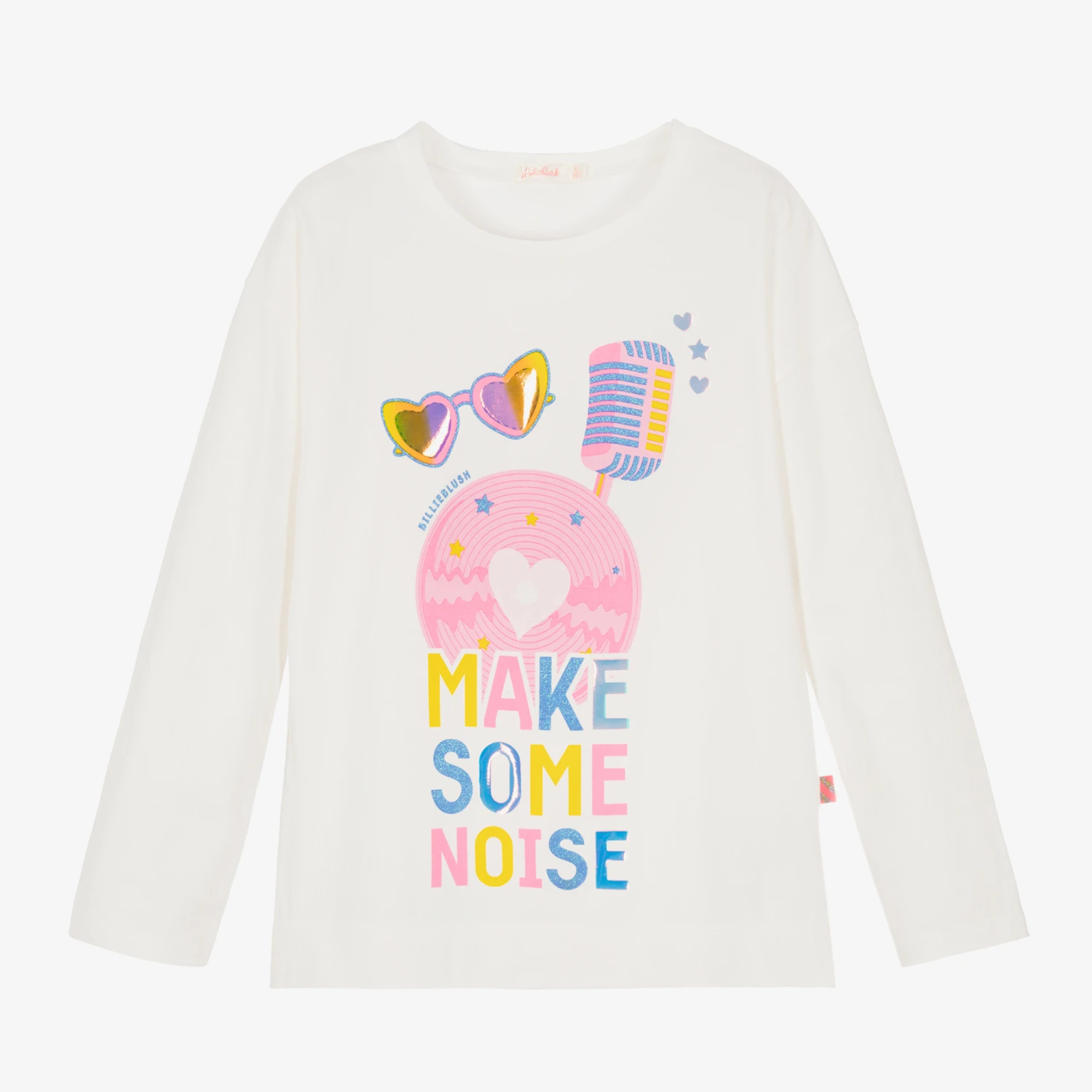 Ivory cotton top for girls by Billieblush. Made in soft and stretchy jersey, there is a pink, blue and yellow music-themed print on the front, with glitter accents and shimmering iridescent foil details.