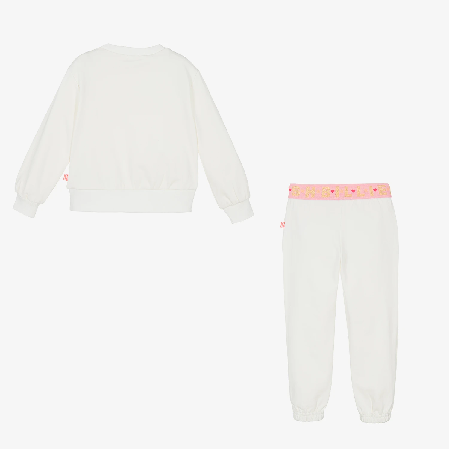 Enjoy glamorous lounging in this ivory tracksuit for girls, by Billieblush. Both items are patterned in glittery palm trees, butterflies and stars for a fun look. Made in the softest cotton jersey, the sweatshirt has an eye-catching pearl logo, with glittery elasticated trims. The pink logo jacquard waistband is stretchy and stylish for comfortable wear.