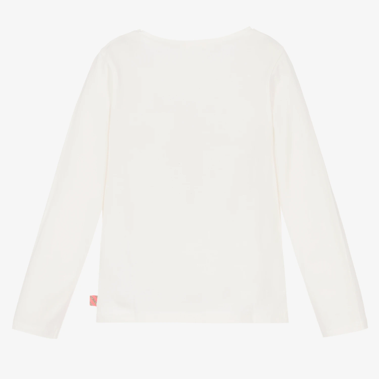 Ivory cotton top for girls by Billieblush. Made in soft and stretchy jersey, there is a ‘Love is Magic’ graphic on the front in lilac purple, pink, aqua blue, and yellow, with silver sequin details.