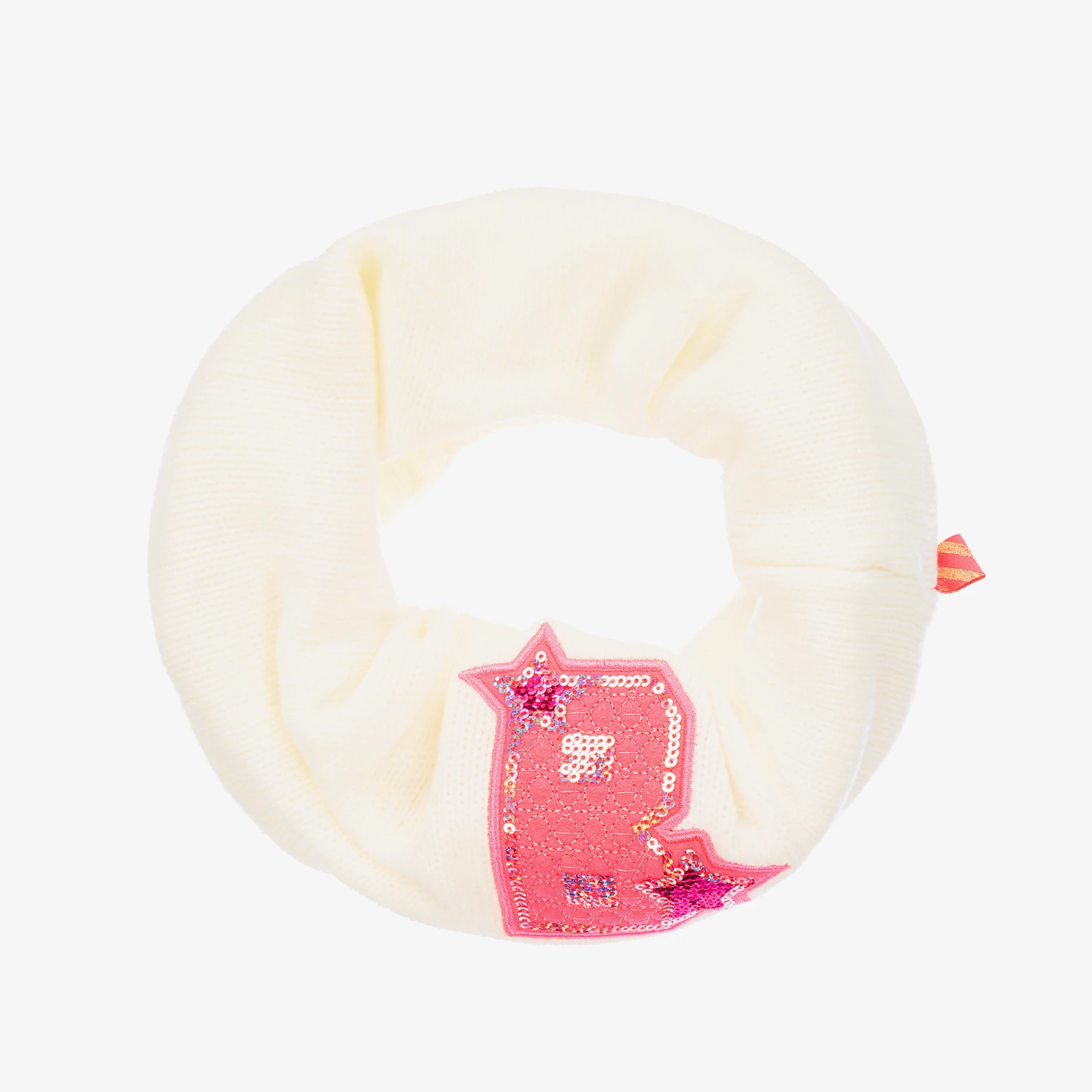 Cosy ivory snood for girls by Billieblush, knitted from soft acrylic with a polar fleece lining. It has an embroidered pink logo ‘B’ on the front and a logo tab on the side seam.