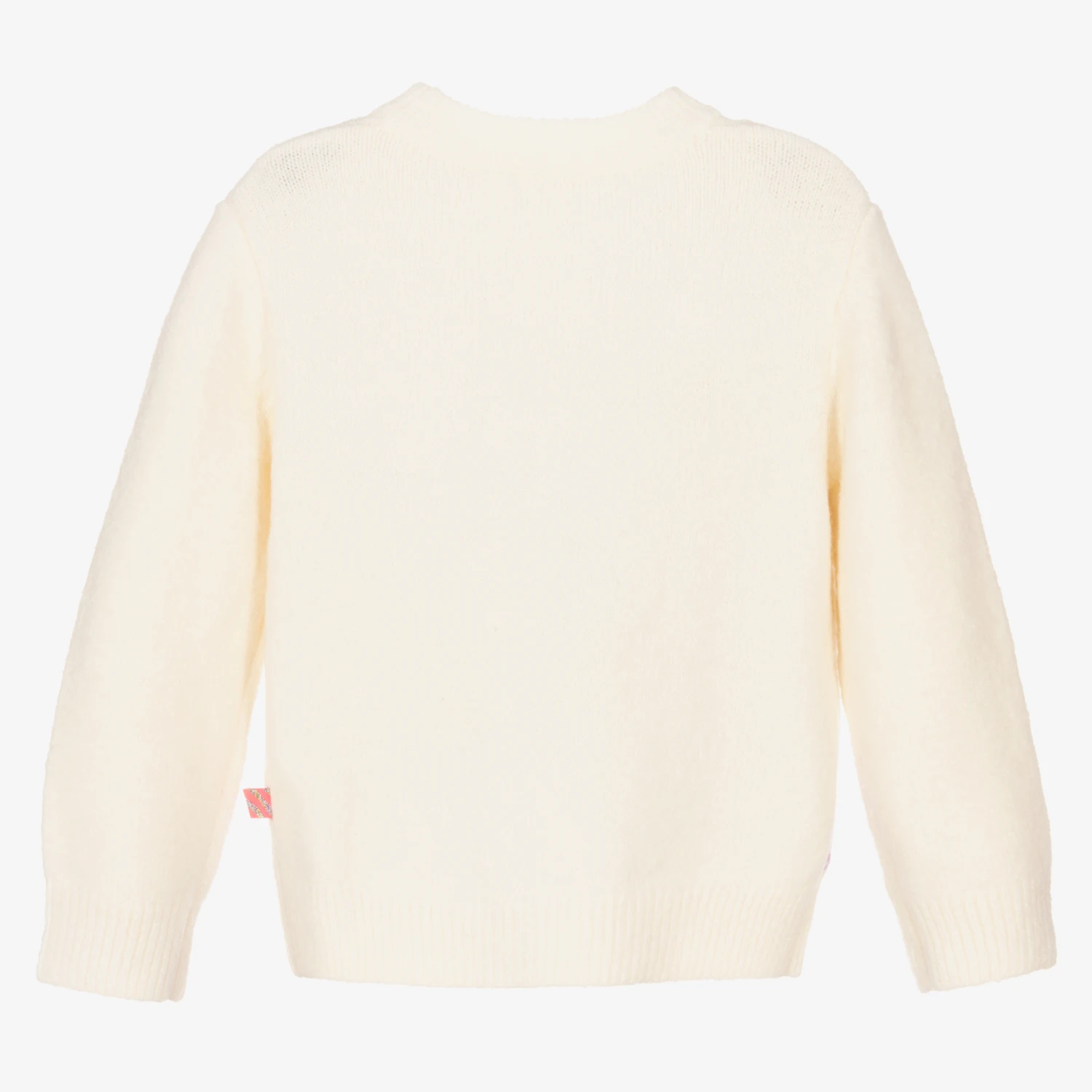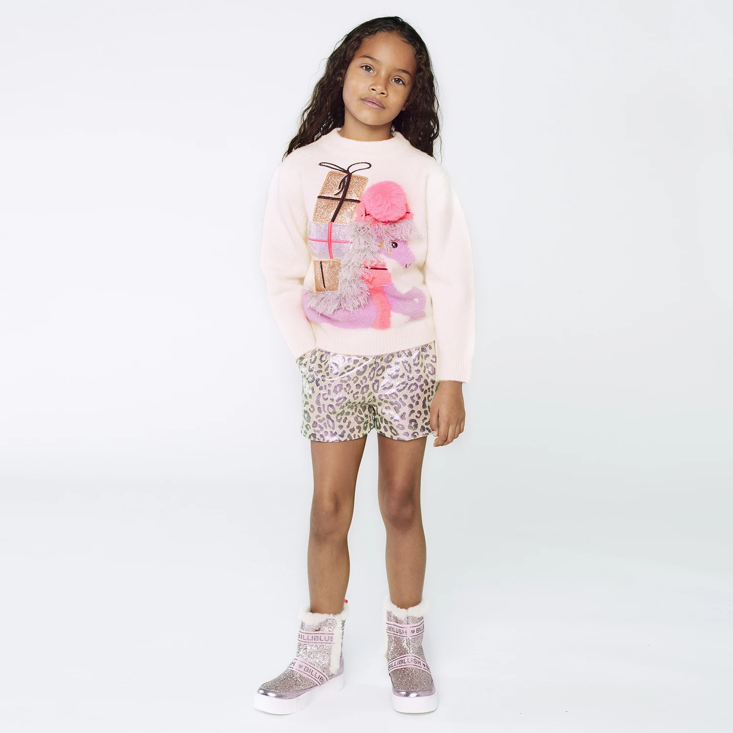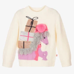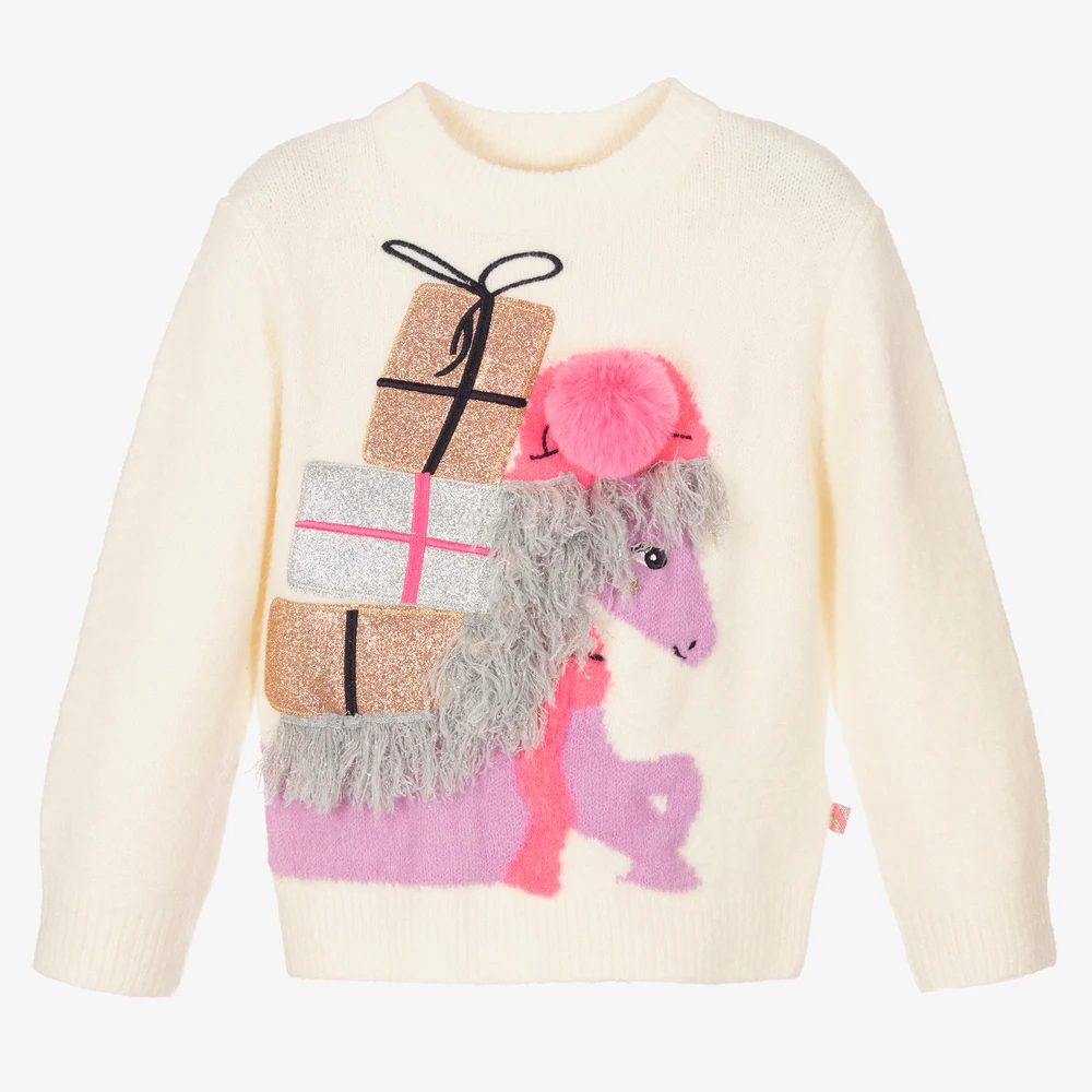 Ivory glitter sweater for girls by Billieblush, made in a soft, mid-weight knit. This cosy jumper has a jacquard festive unicorn design in lilac purple and neon pink, with a sparkly grey mane, embroidered gold and silver glitter gifts and a neon pink faux fur pom-pom.