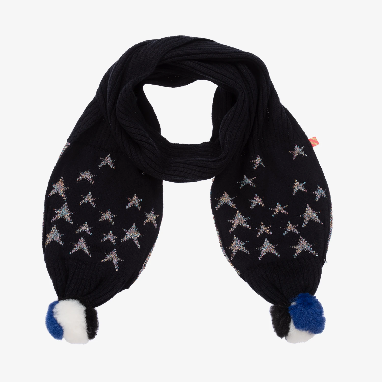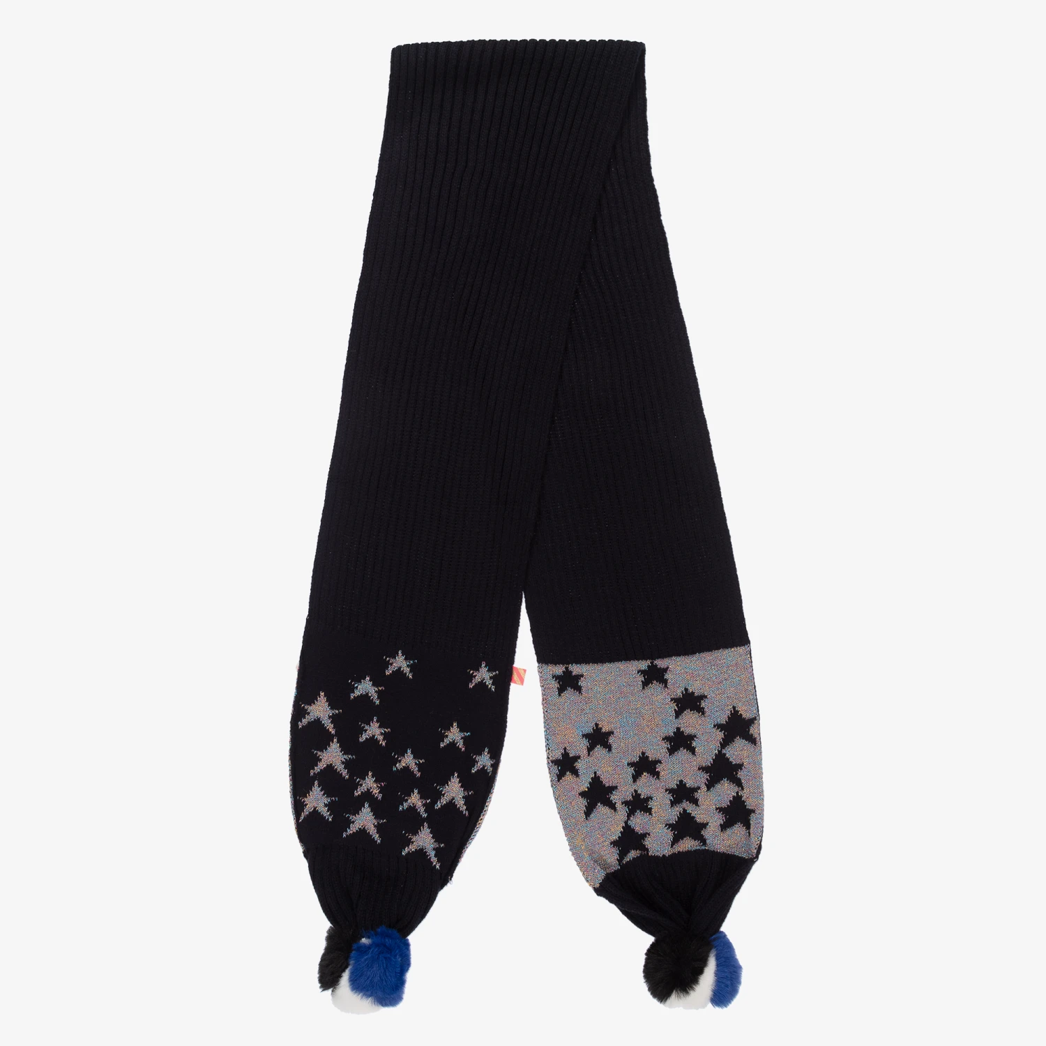Vibrant navy blue scarf for girls by Billieblush, knitted from a soft acrylic blend. With blue and white faux fur pom-poms on each end, it has glittery multi-coloured silver star embroidery on the front and navy blue stars on a glittery background on the reverse.