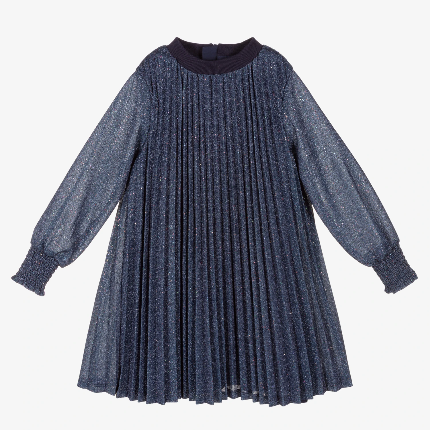 Ideal for a party, pretty navy blue dress for girls by Billieblush. Made in sparkly pleated polyester, it has sheer sleeves with gorgeous shirred cuffs for a stylish look. Lined in lightweight viscose, it fastens with a zip on the back.