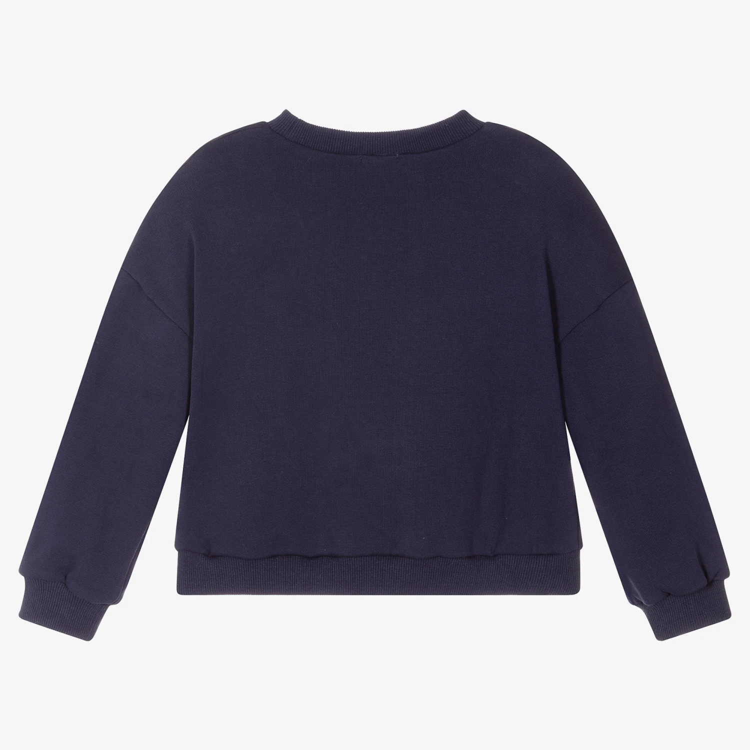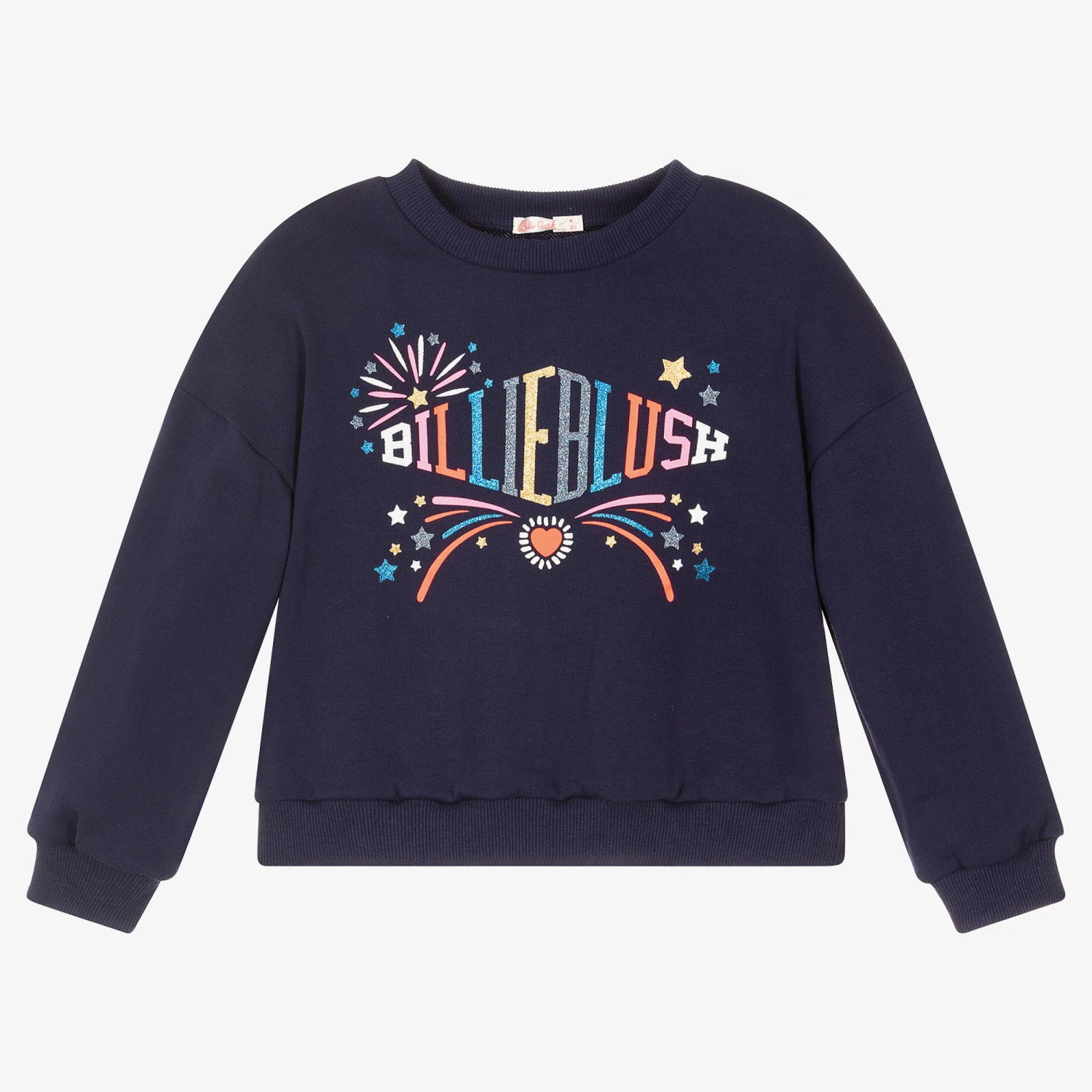 Navy blue sweatshirt for girls by Billieblush, made in soft cotton sweatshirt jersey. The front has glittery, multicoloured logo surrounded by stars and heart.