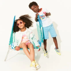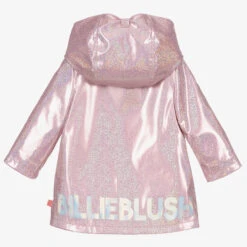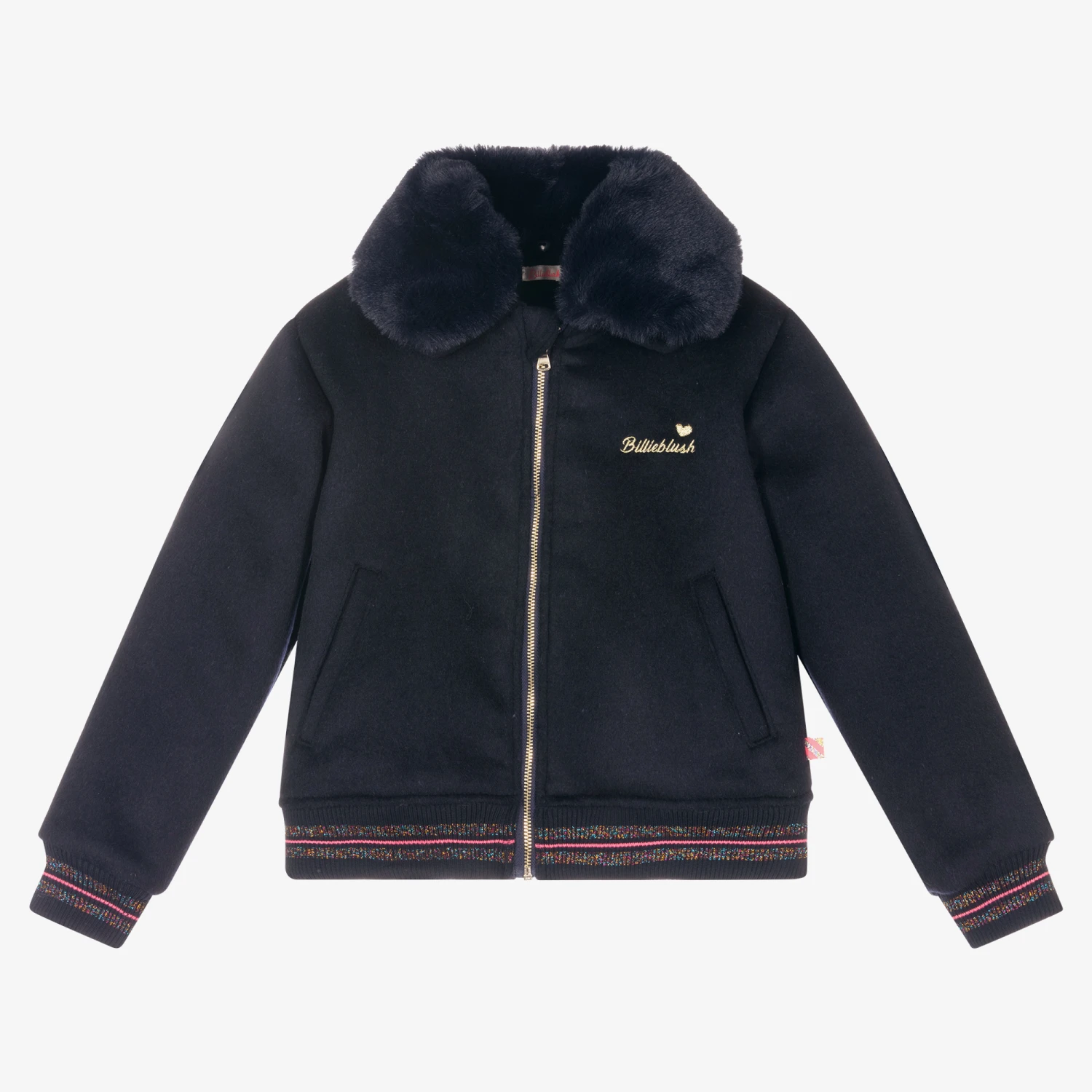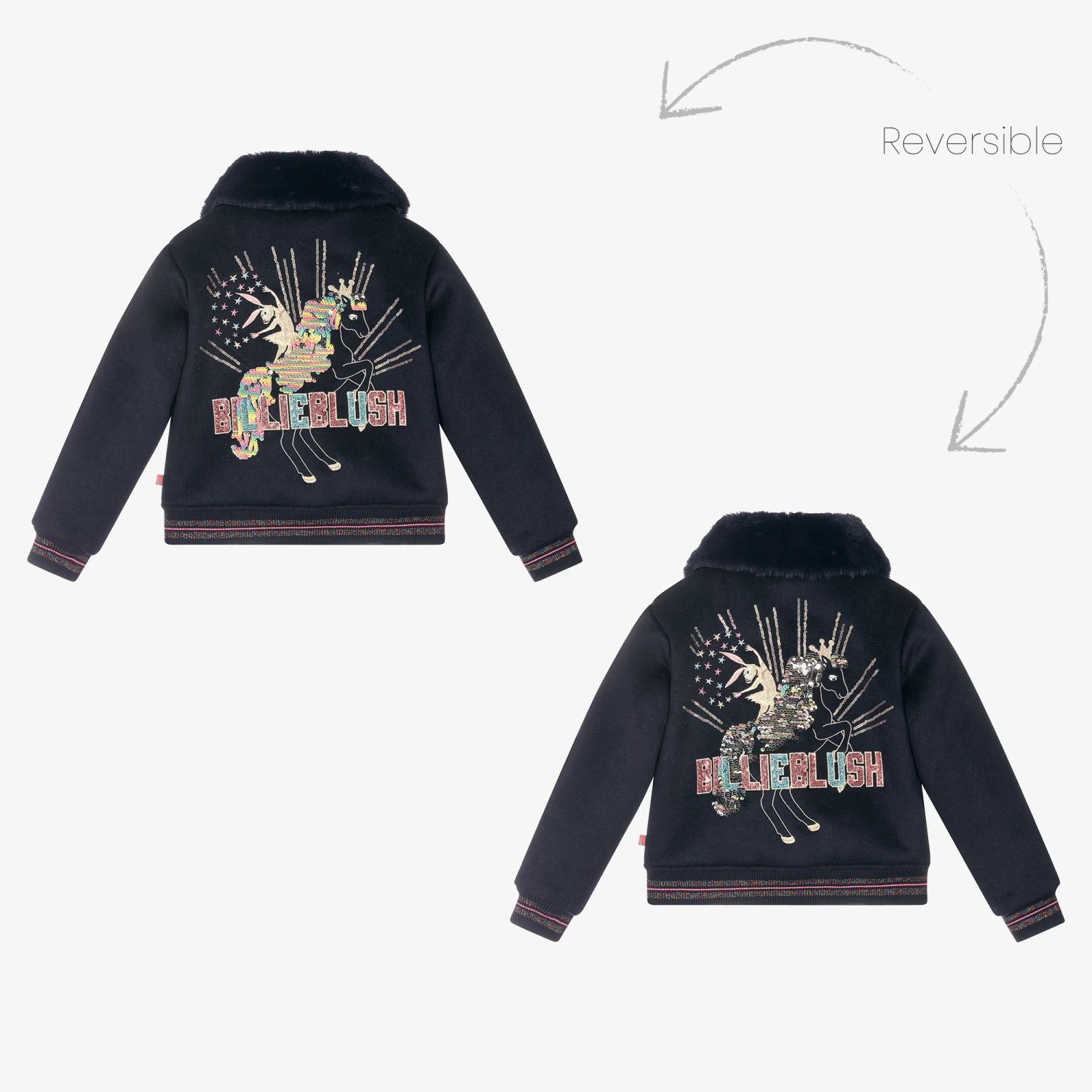 Navy blue wool-blend jacket for girls by Billieblush, with glittery ribbed trims and a removable faux fur collar. It fastens with a zip, has two front pockets, and a quilted satin lining. There is gold logo embroidery on the front, with a fun and colourful reversible sequin horse, rabbit and logo design on the back.