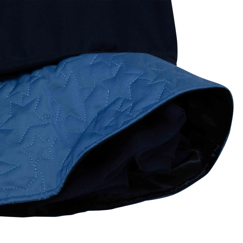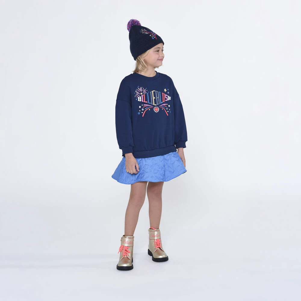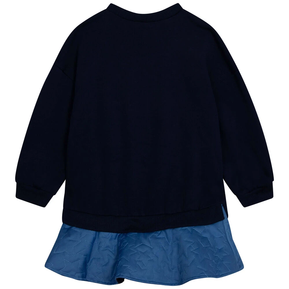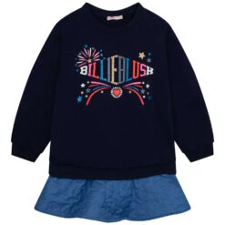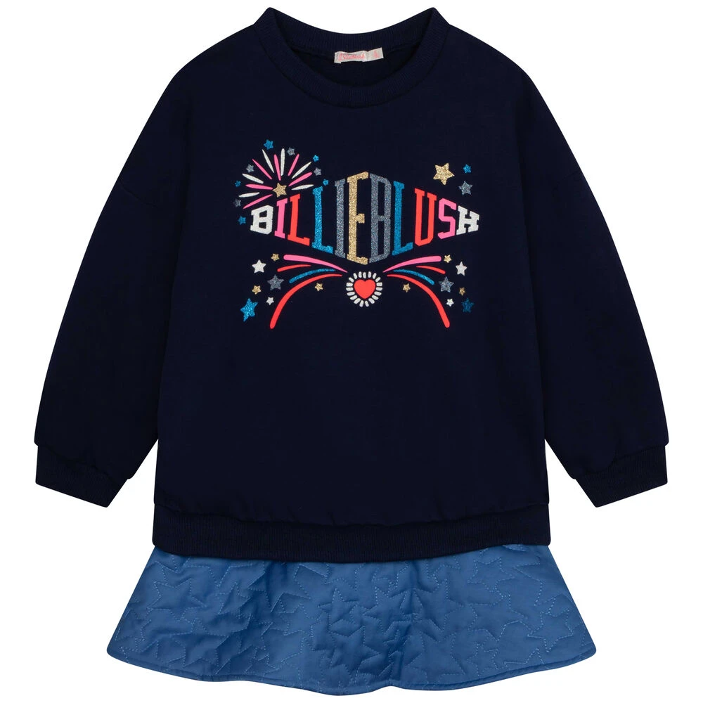 Navy logo dress for girls by Billieblush. Made from soft cotton, it features glitter logo print and dropped shoulders. It has twill skirt with embroidered stars and the silky under layers have a tulle frill attached to add extra volume.