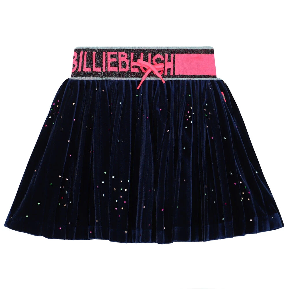 Navy logo skirt for girls by Billieblush. Made from soft velour, it features multicolored metal studs. An elasticated glitter waistband with neon pink jacquard logo and drawstring tie for comfortable fit.