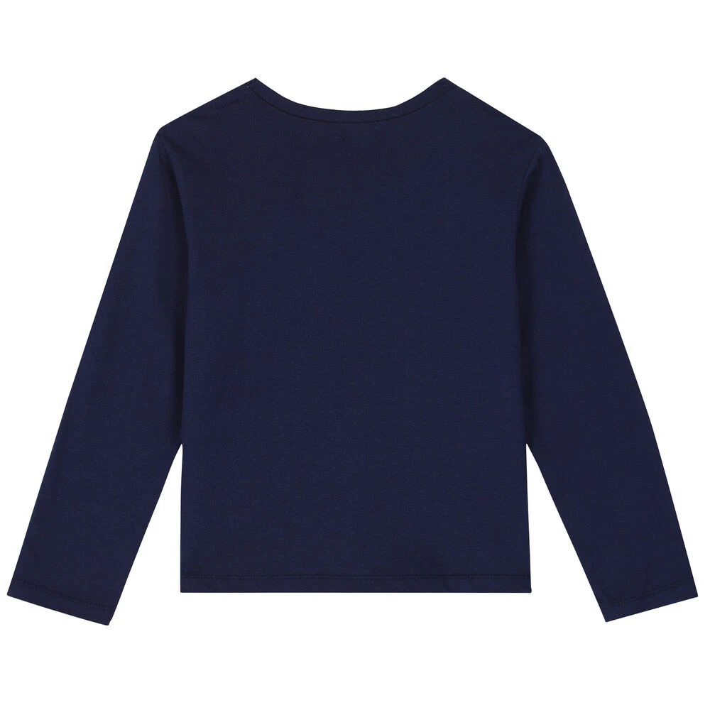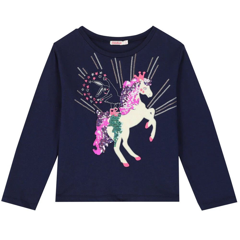 Navy unicorn sequin long sleeve top for girls by Billieblush. Made from soft cotton, it features embellished reversible sequin unicorn on the front.