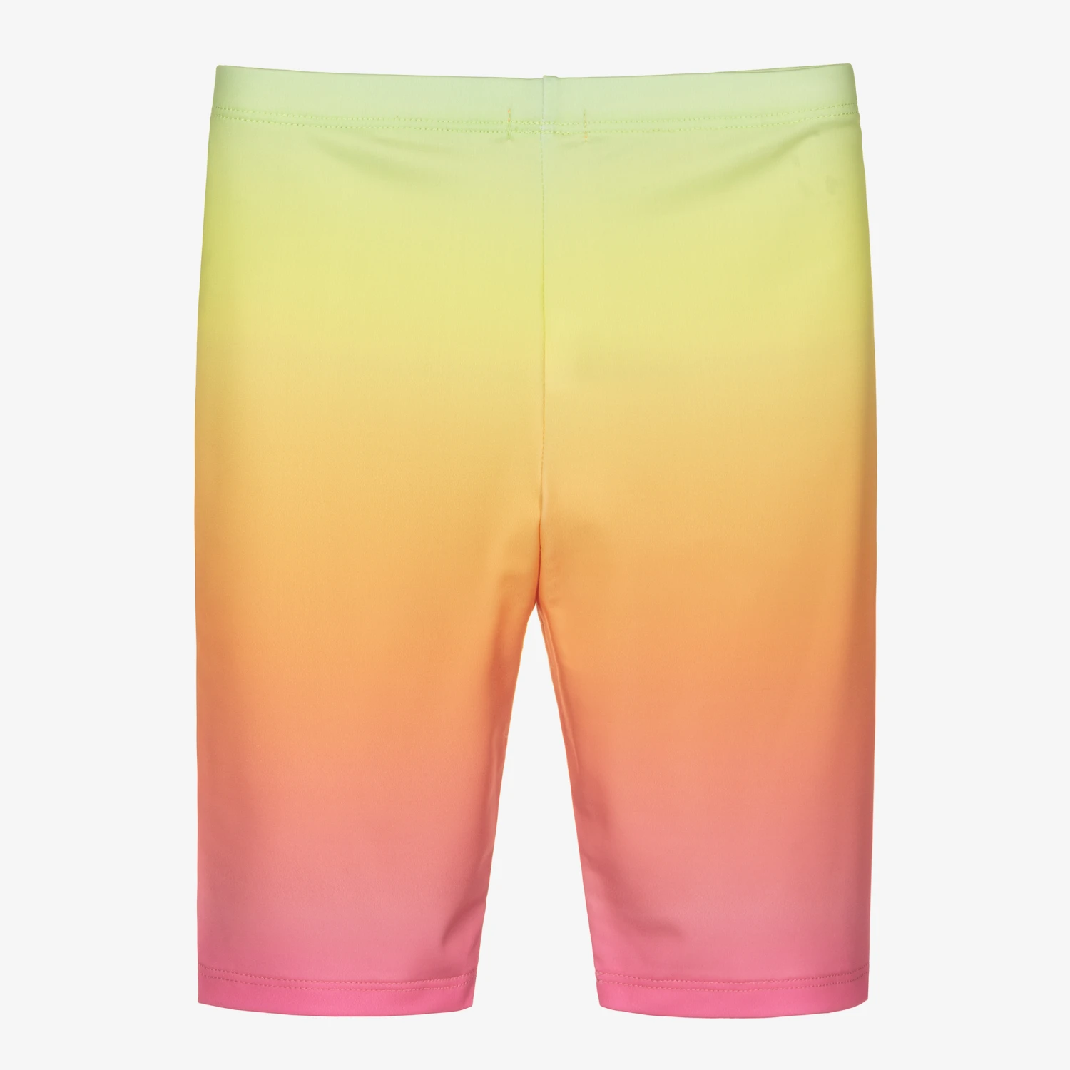 Bright and sporty cycling shorts by Billieblush, with a cool ombré effect in green, yellow, orange and pink. Made in soft and stretchy lycra, they have the brand’s logo printed in neon pink on one leg.