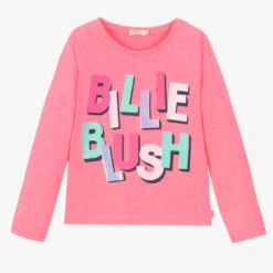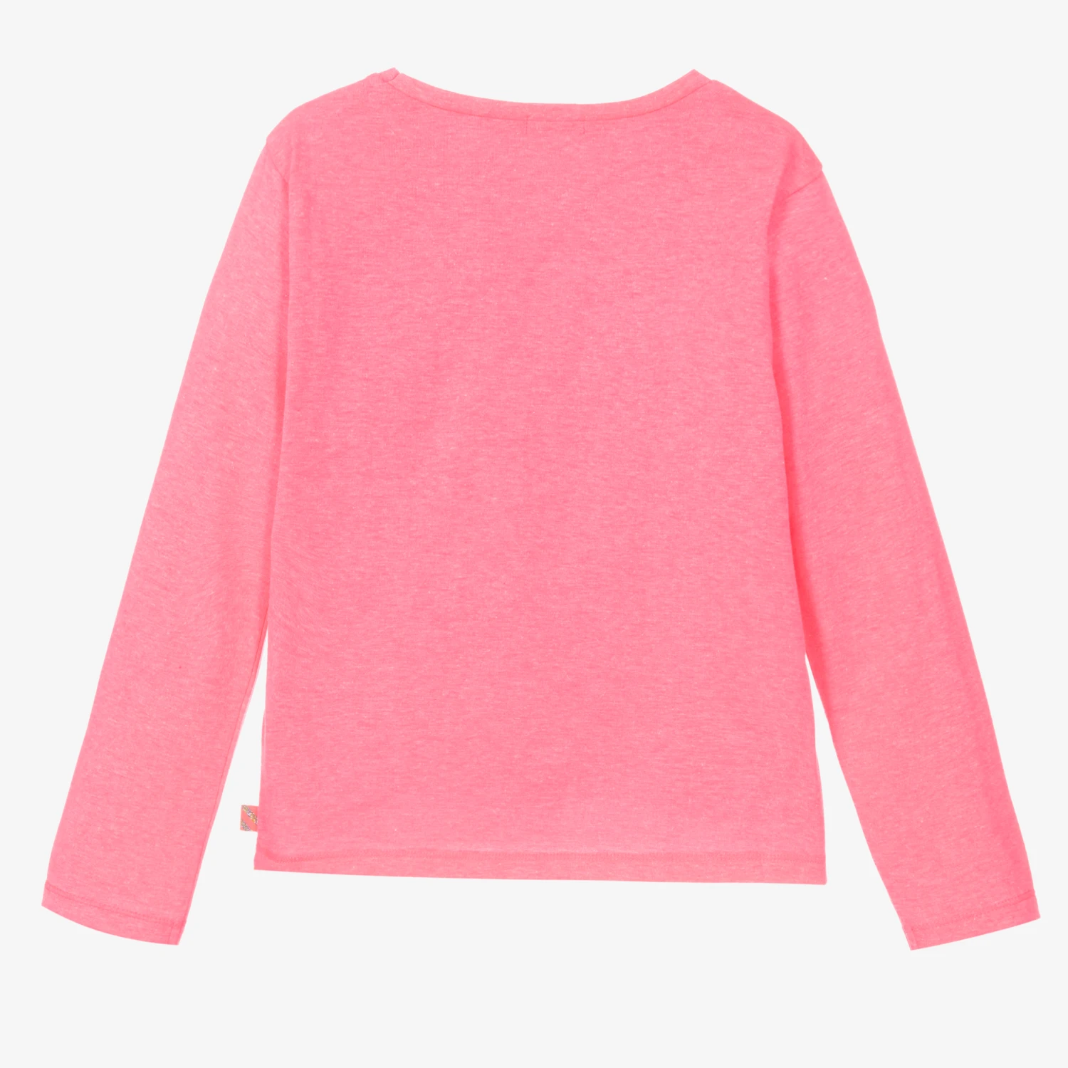 Bold neon pink top for girls by Billieblush, made in super soft polycotton jersey. It has a sparkly sequin logo print on the front in tonal pink and blue.