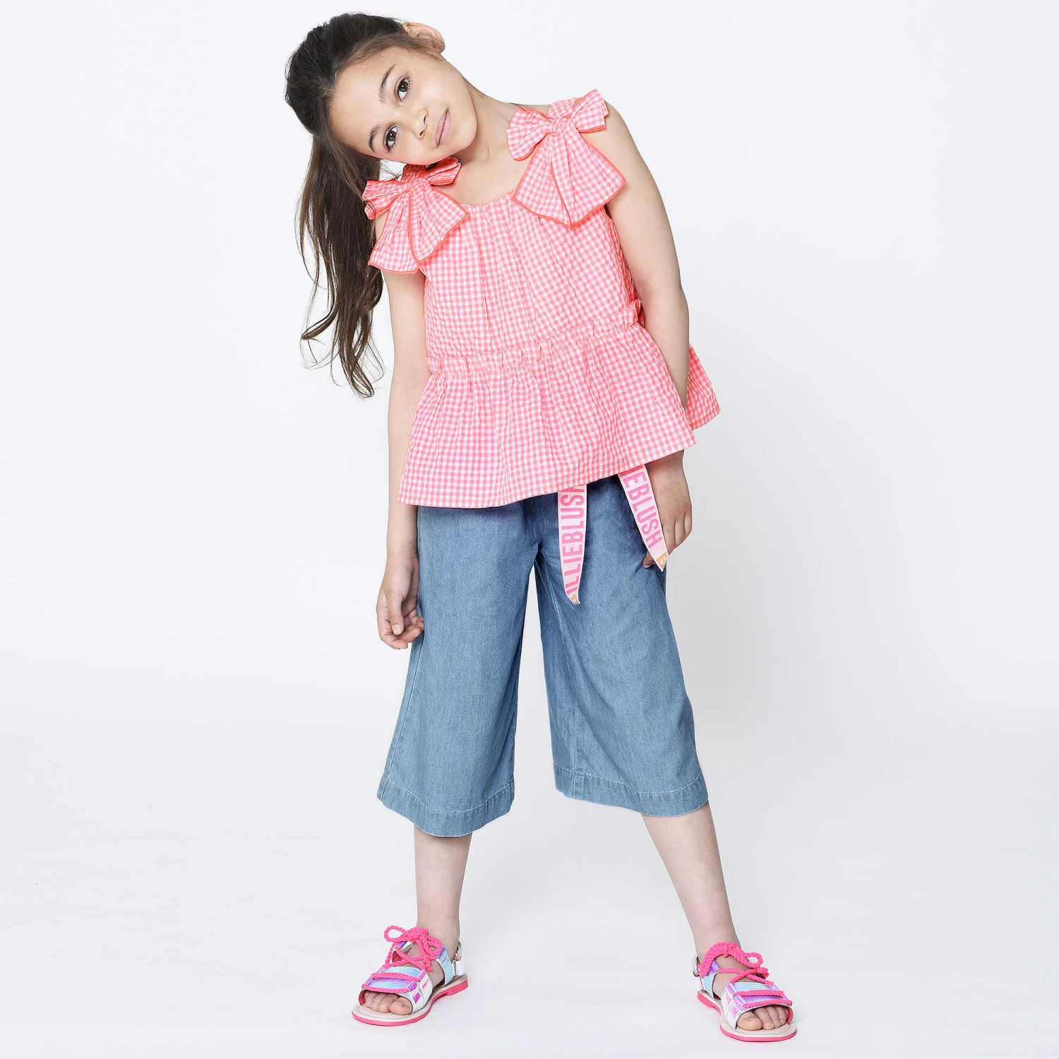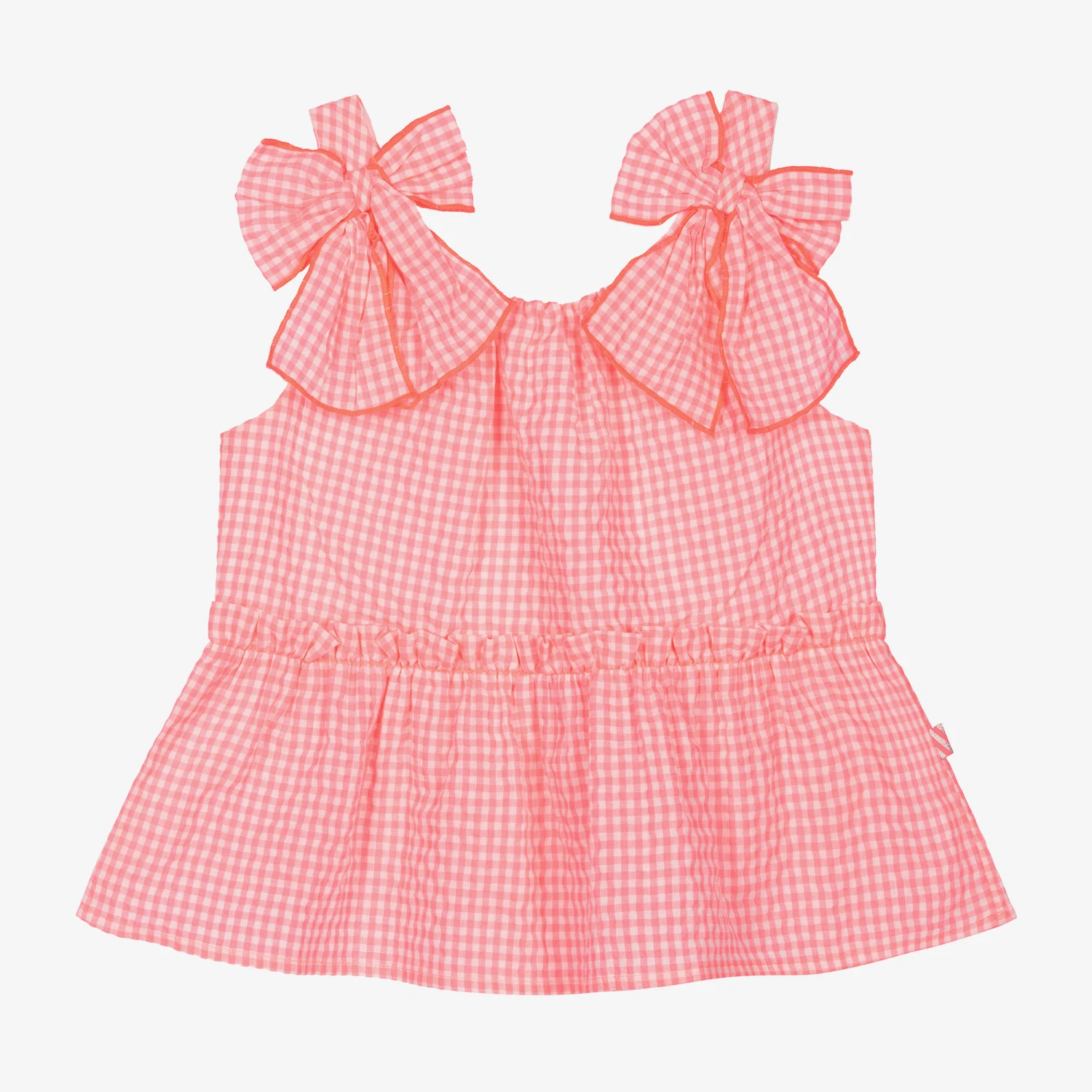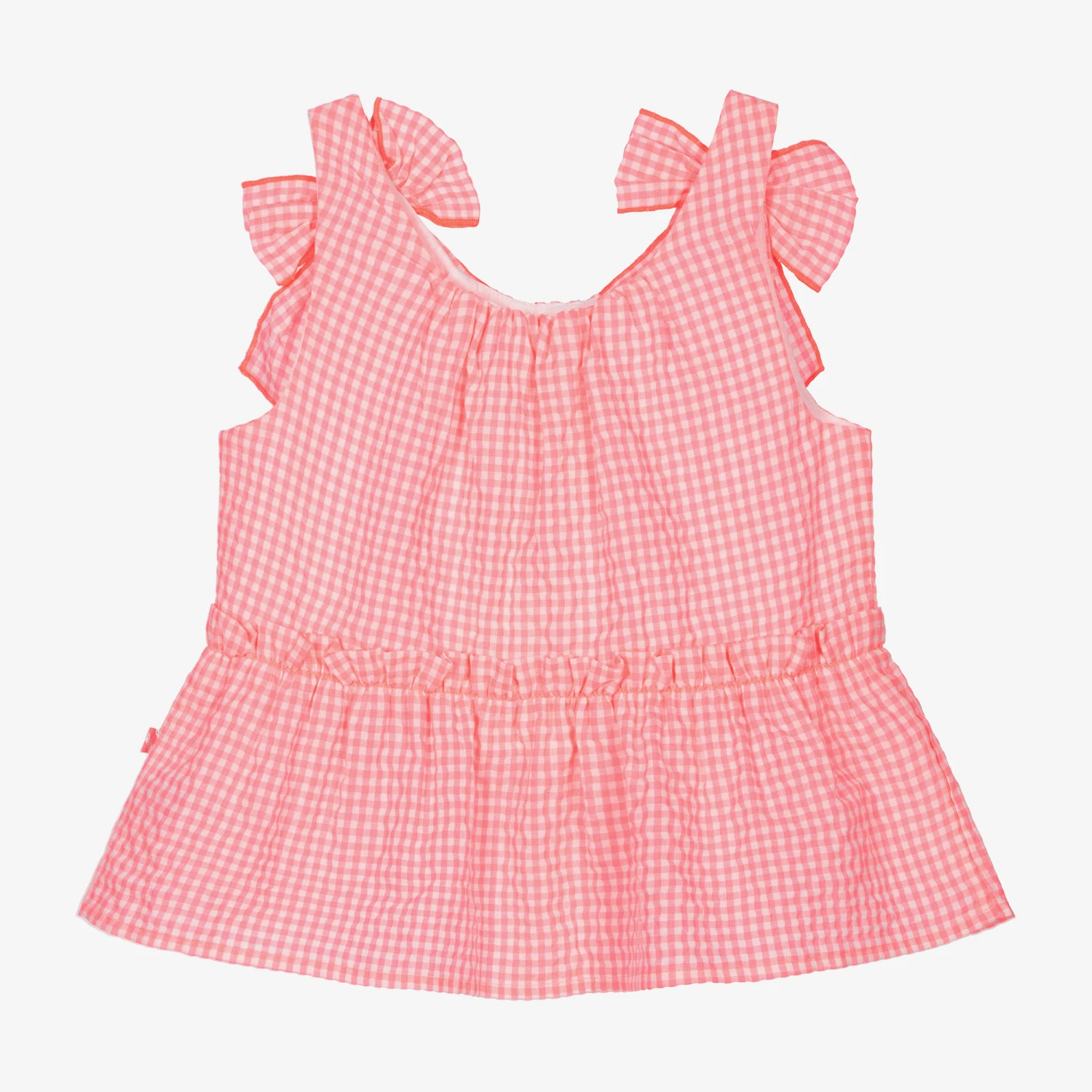 Pretty neon pink peplum blouse for girls, by Billieblush. Woven with soft cotton seersucker, it has lovely oversized, fixed bows on the straps, and a sweet ruffle trim around the waist.