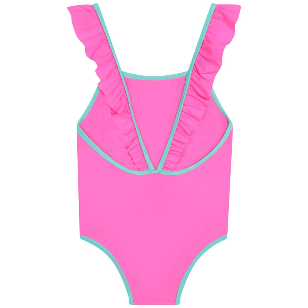 Bright pink swimming costume for girls by Billieblush. Made from soft, silky polyester, it features a glittery heart applique pineapple on the front and has ruffle trims to the shoulder and back straps. Comes with a branded storage pouch.