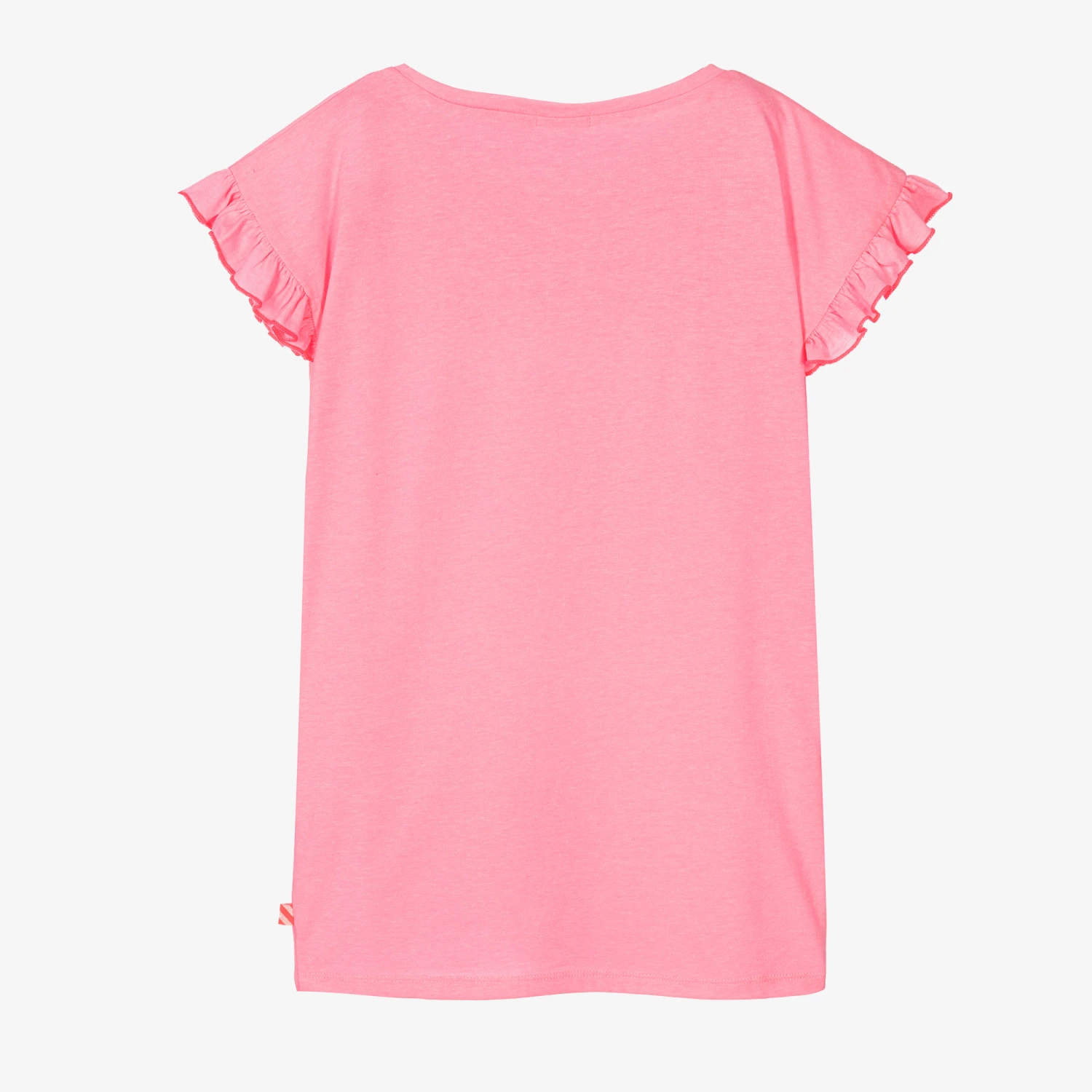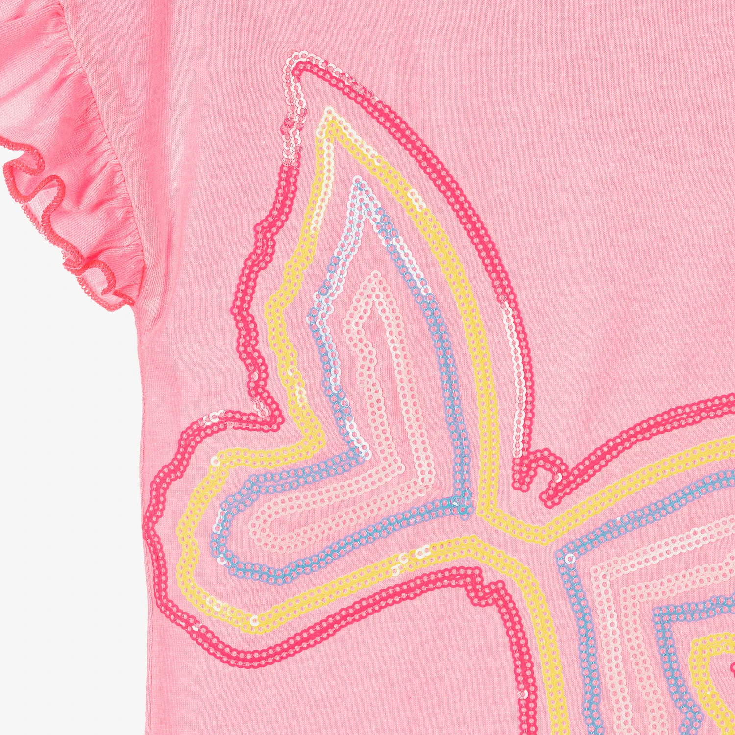Cute and girly neon pink T-shirt dress for girls by Billieblush, made in a soft cotton jersey blend. It has a vibrant sequin butterfly design on the front, with pretty ruffled sleeves and the brand’s iconic tag logo on the side.