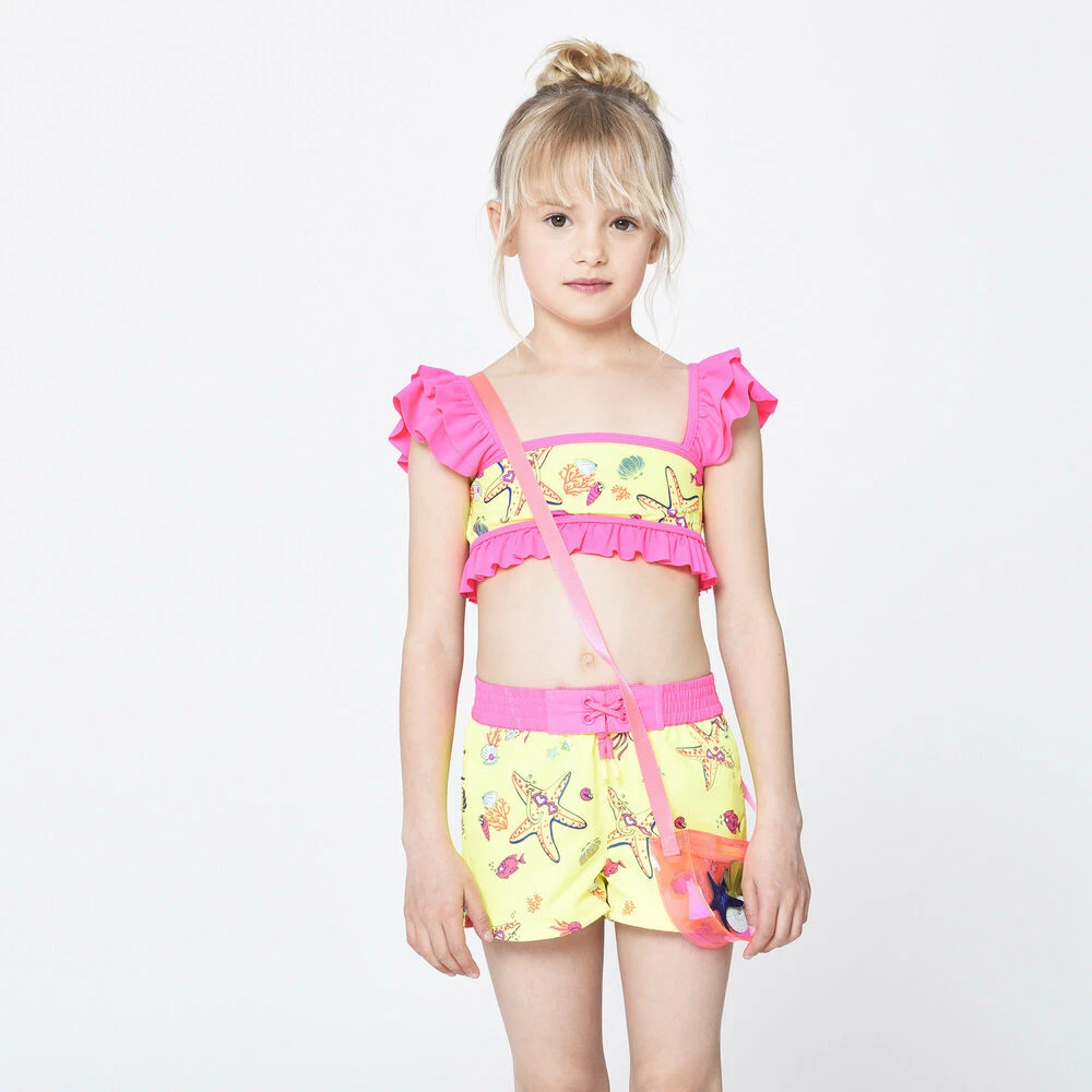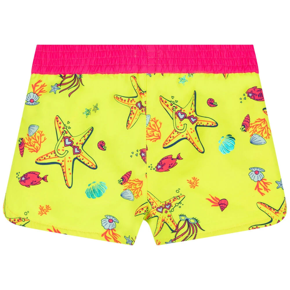 Bright neon yellow swim shorts for girls by Billieblush. Made from soft silky polyester they have an allover starfish print and a pink elasticated waistband with a drawstring.