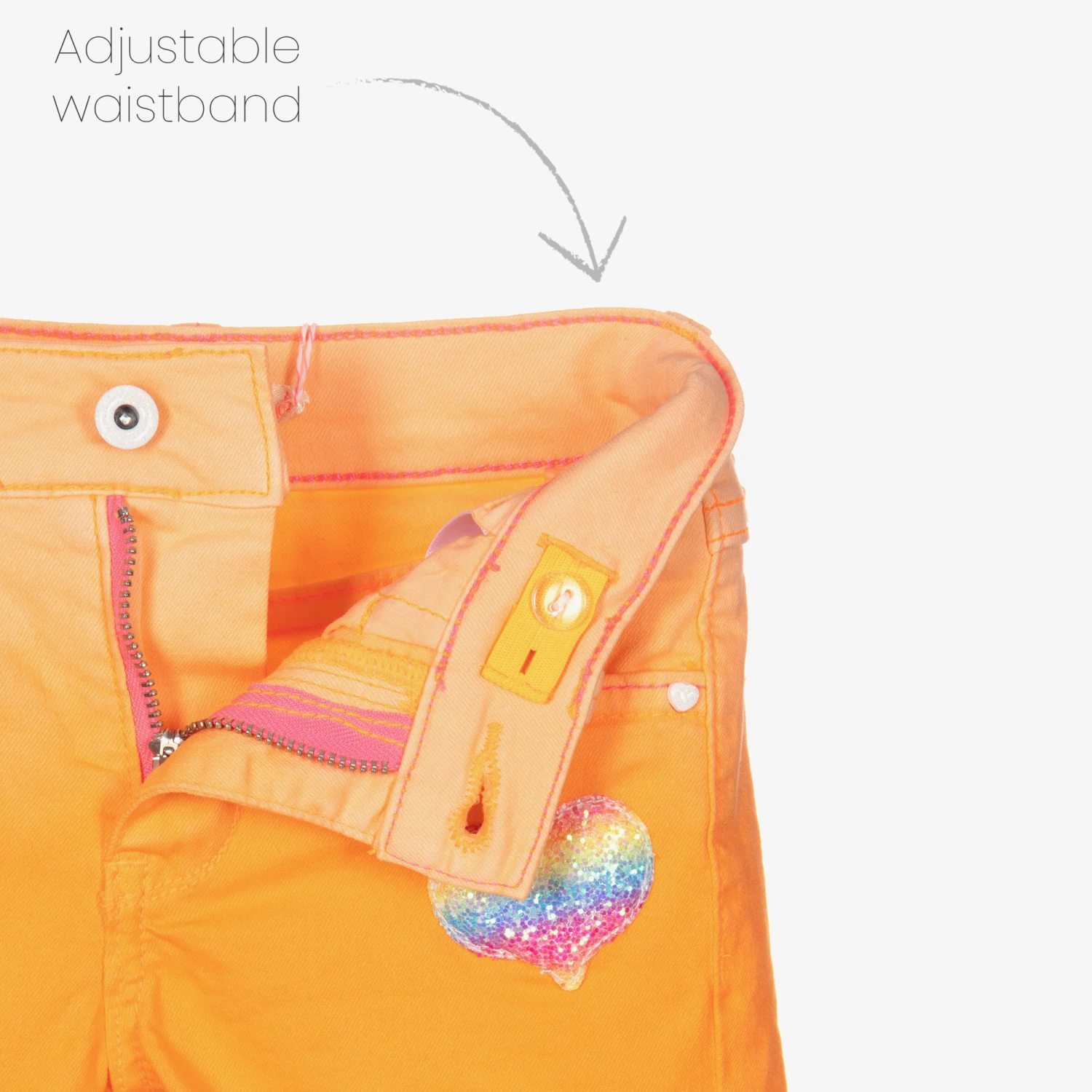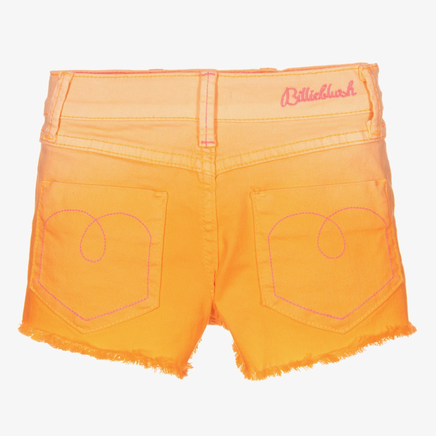 Casual shorts for girls by Billieblush, made in orange ombré stretch denim. They are trimmed in the brand’s signature neon pink, with a matching logo embroidered on the back of the adjustable waistband. They have a glittery rainbow-coloured heart appliqué on one side and frayed cuffs.