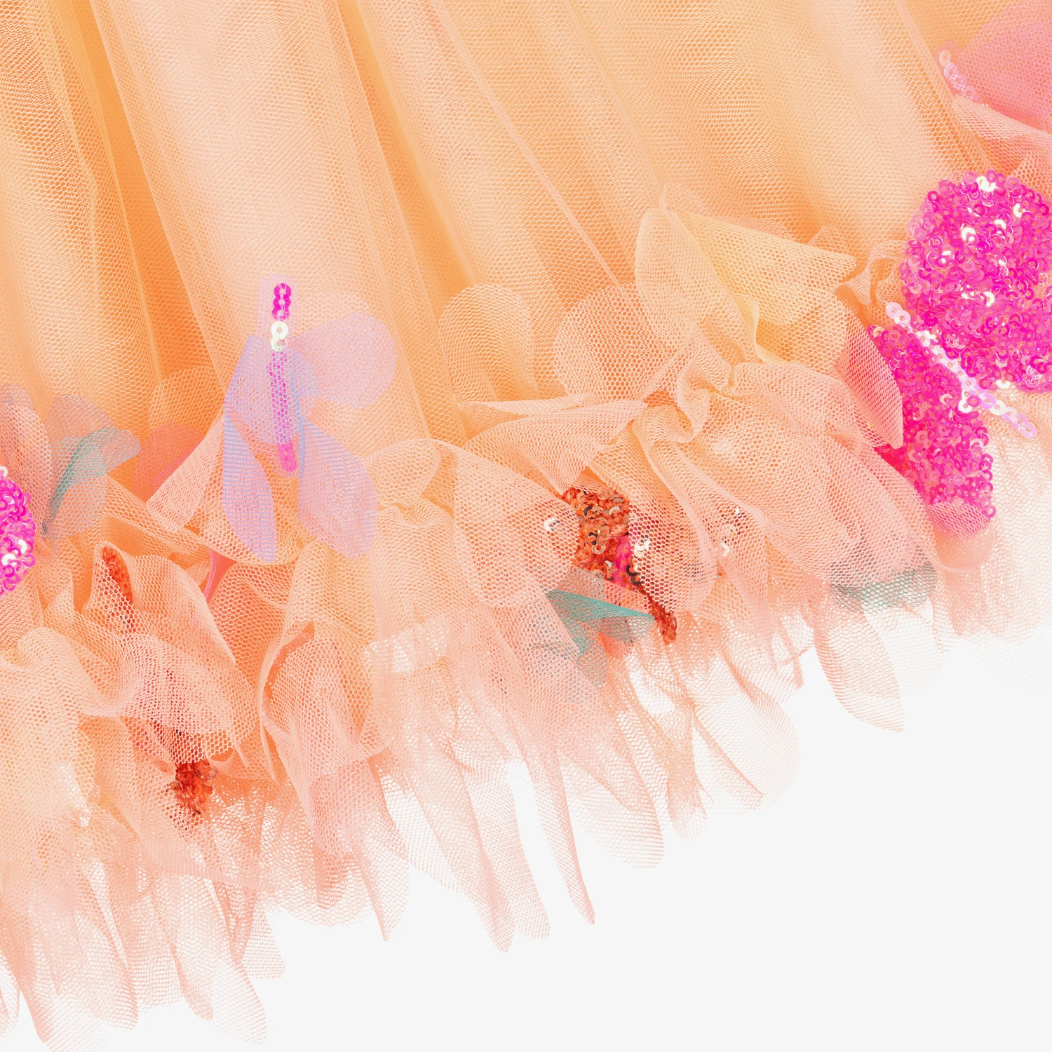 Lovely bright orange skirt for girls by Billieblush, made in layers of lightweight tulle. It has petal frills around the hem decorated in eye-catching blue, pink and gold butterflies shimmering with sequins. It has a comfortable, elasticated waist and a soft lining for comfort.