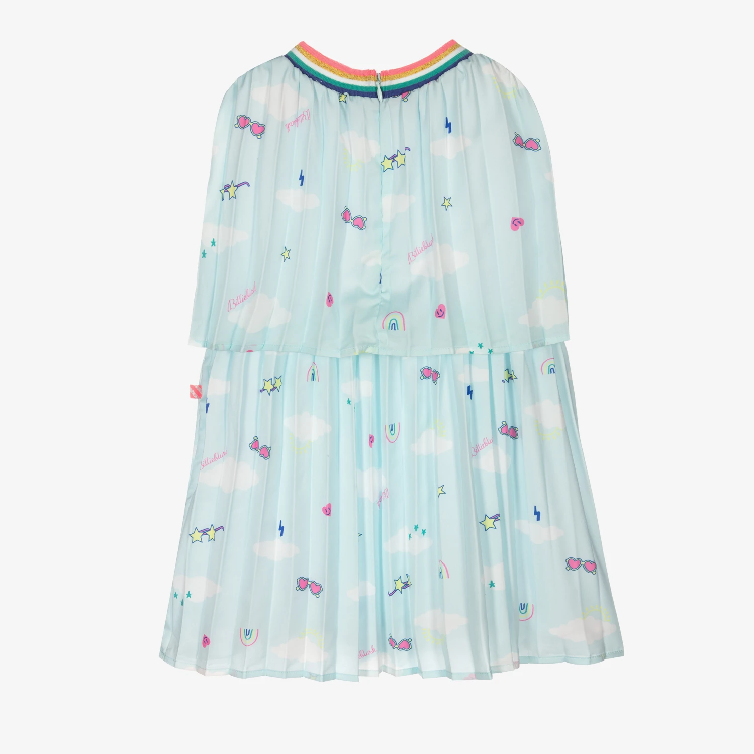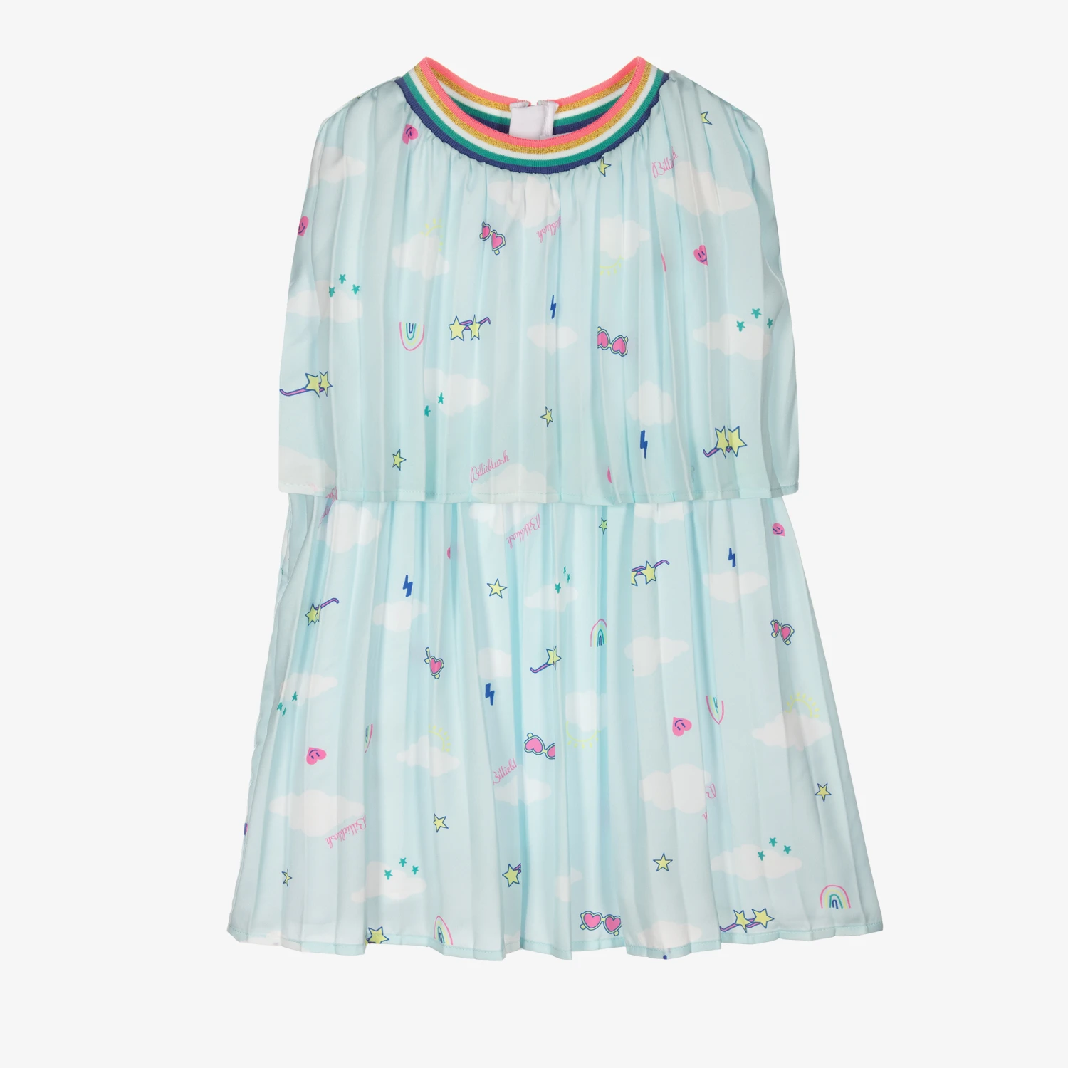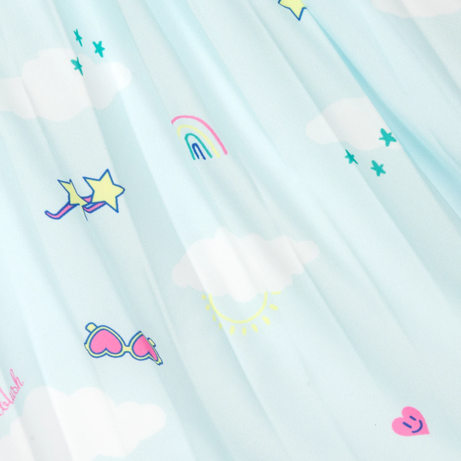 Pretty pale blue pleated sleeveless dress for girls by Billieblush, made in lightweight silky polyester. This tiered dress has a fun cloud pattern with smiling heart, sunglasses and sun prints. Fully lined with soft, lightweight viscose, it has a ribbed collar in vibrant rainbow colours.